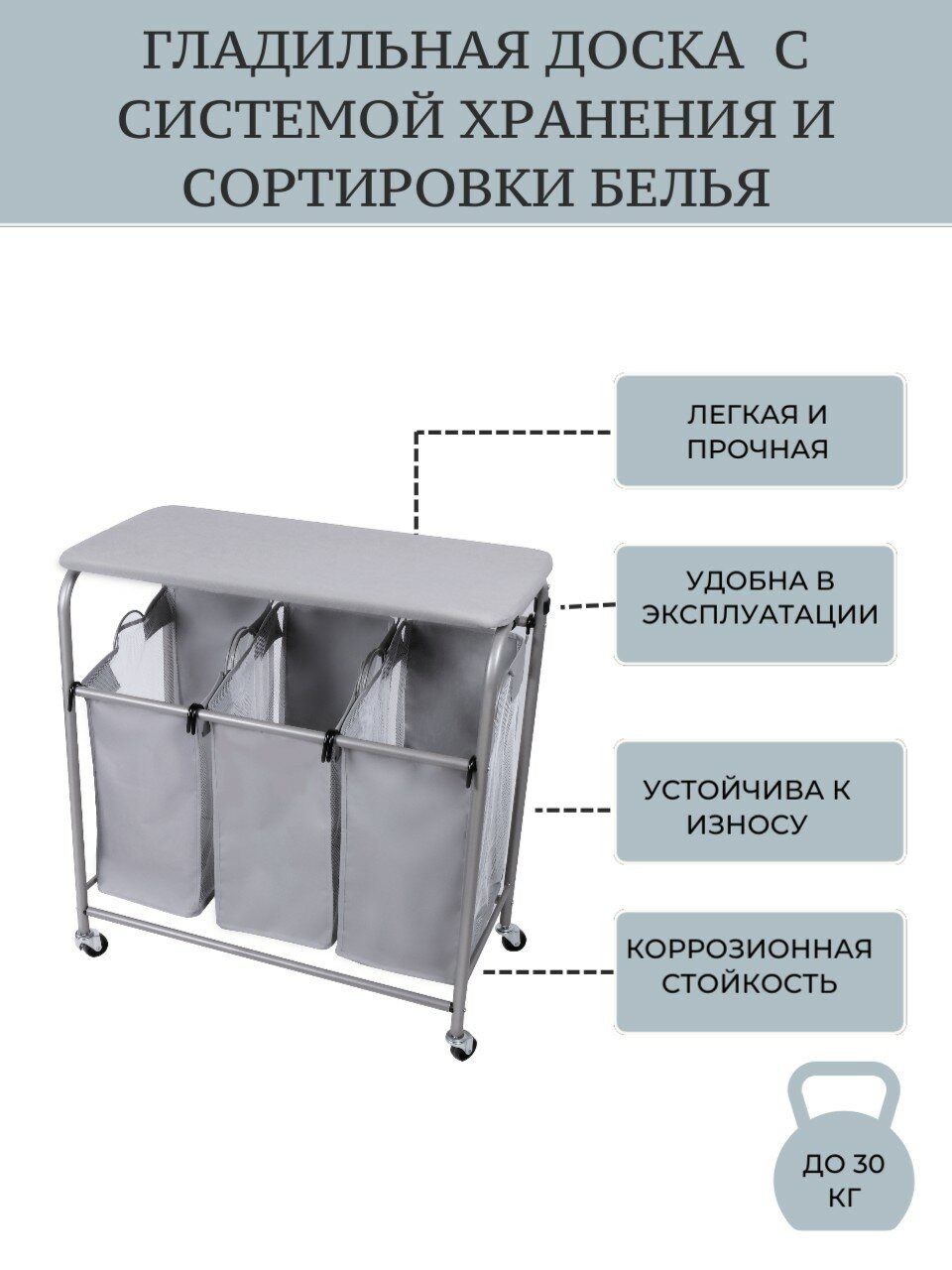 Гладильная доска с системой хранения (Три бельевых мешка) на колесах Д-02 интересное: