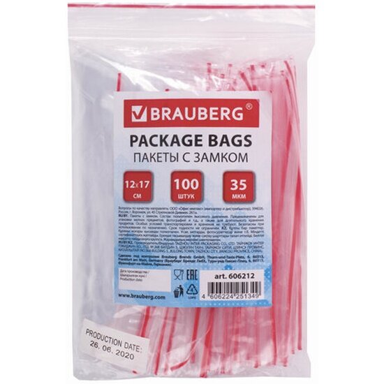 Пакеты с замком Brauberg "зиплок", (гриппер), 100 шт, 120х170 мм, ПВД, толщина 35 микрон (606212)