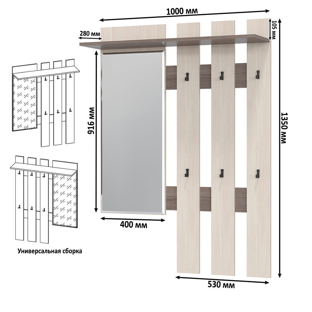 Прихожая с зеркалом и крючками для одежды Арти-4, ШхГхВ: 130х34х208 см, дуб сонома