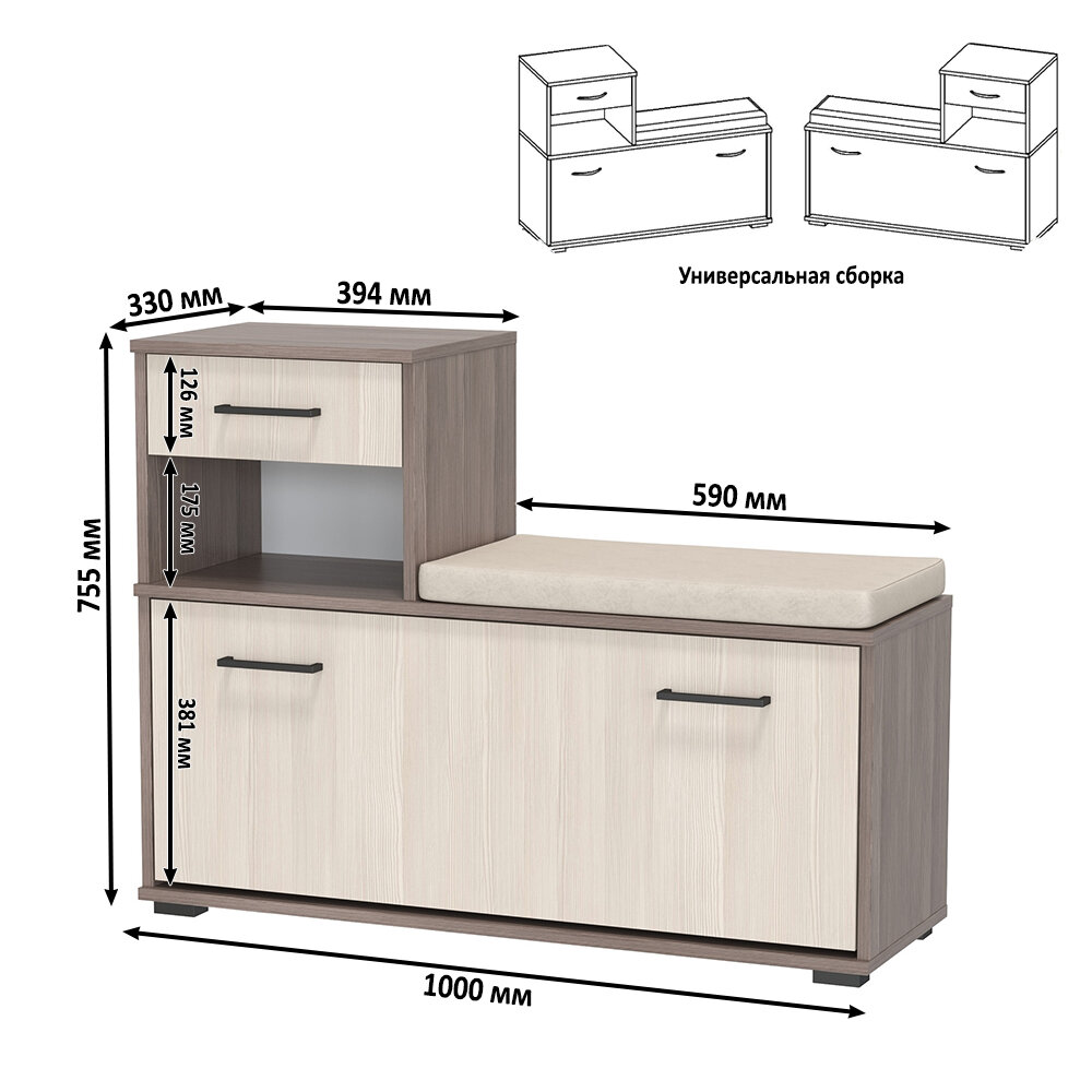 Прихожая комплект САША-6 (правая) от Фант-Мебель, с зеркалом, с обувницей, шкафом и ящиками, 156x203,6x43 см. Ясень темный/Ясень светлый