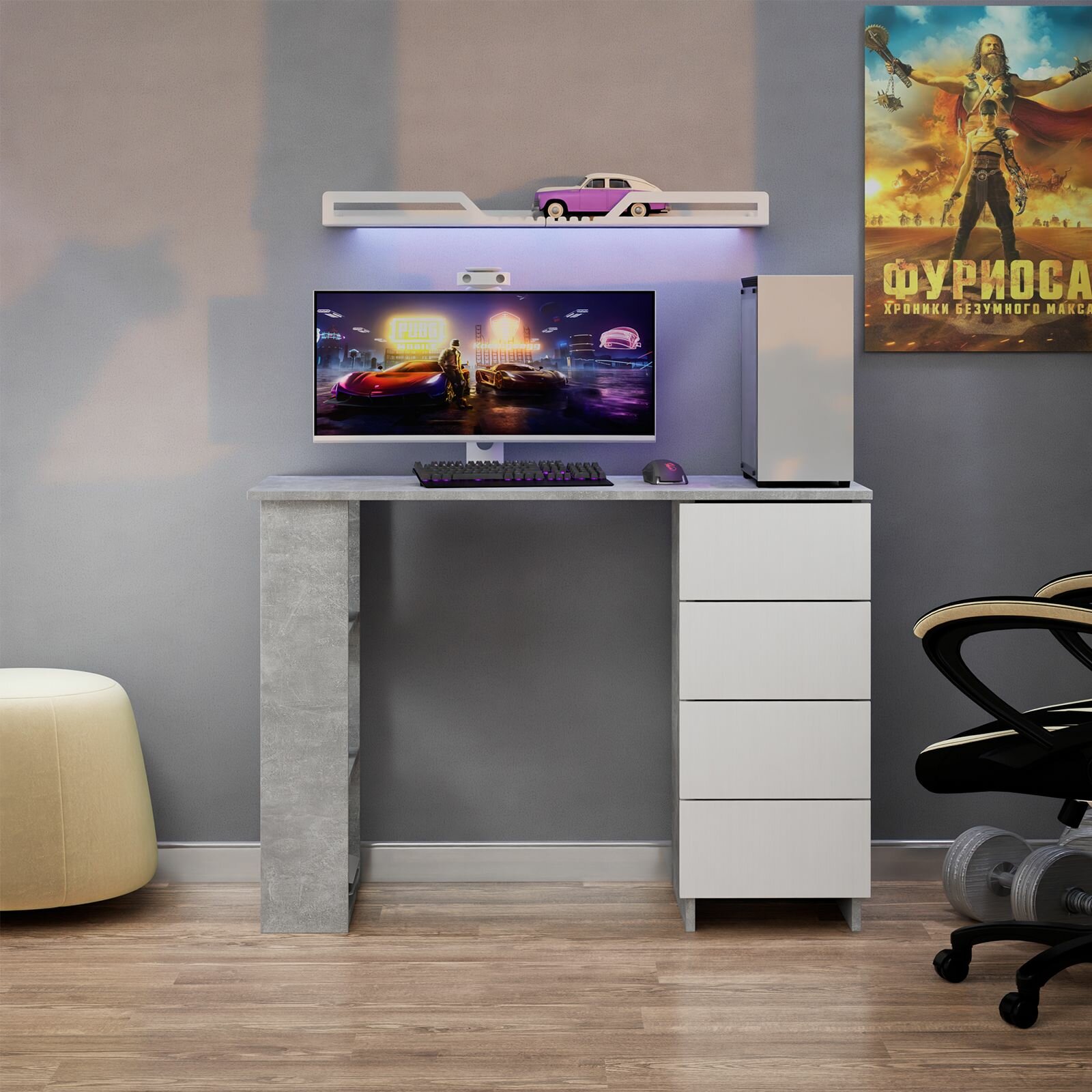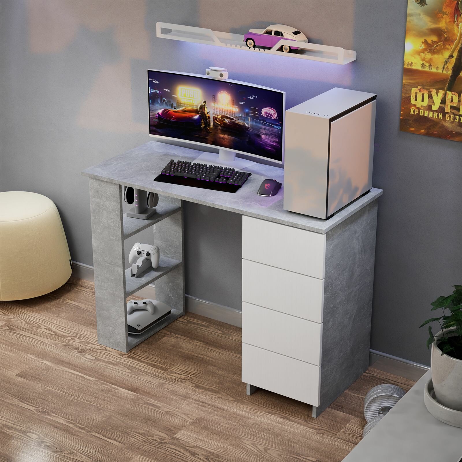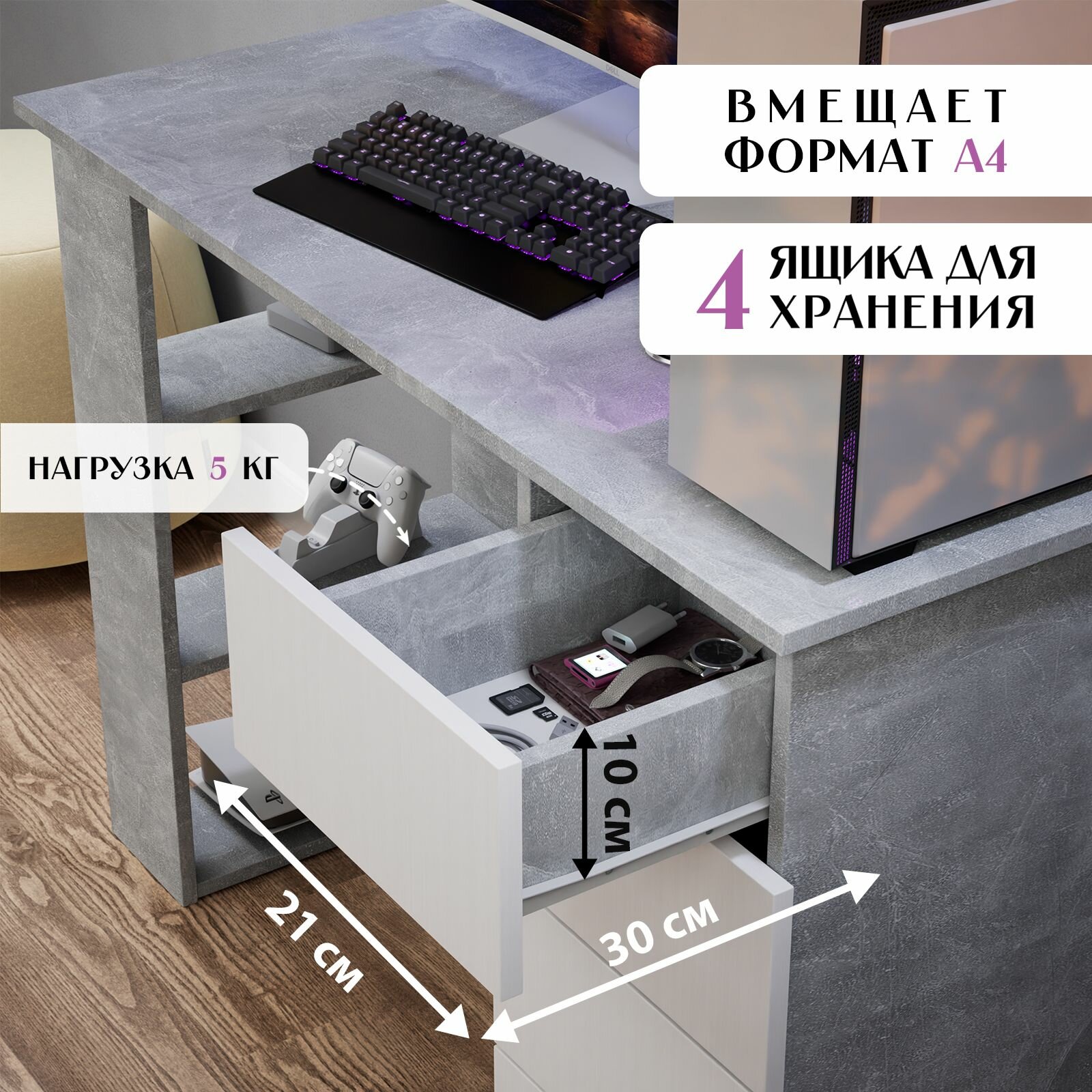 Письменный стол LETTA "Бетон", ЛДСП, 4 ящика, полки, 105,6 см x 45 см x 75 см