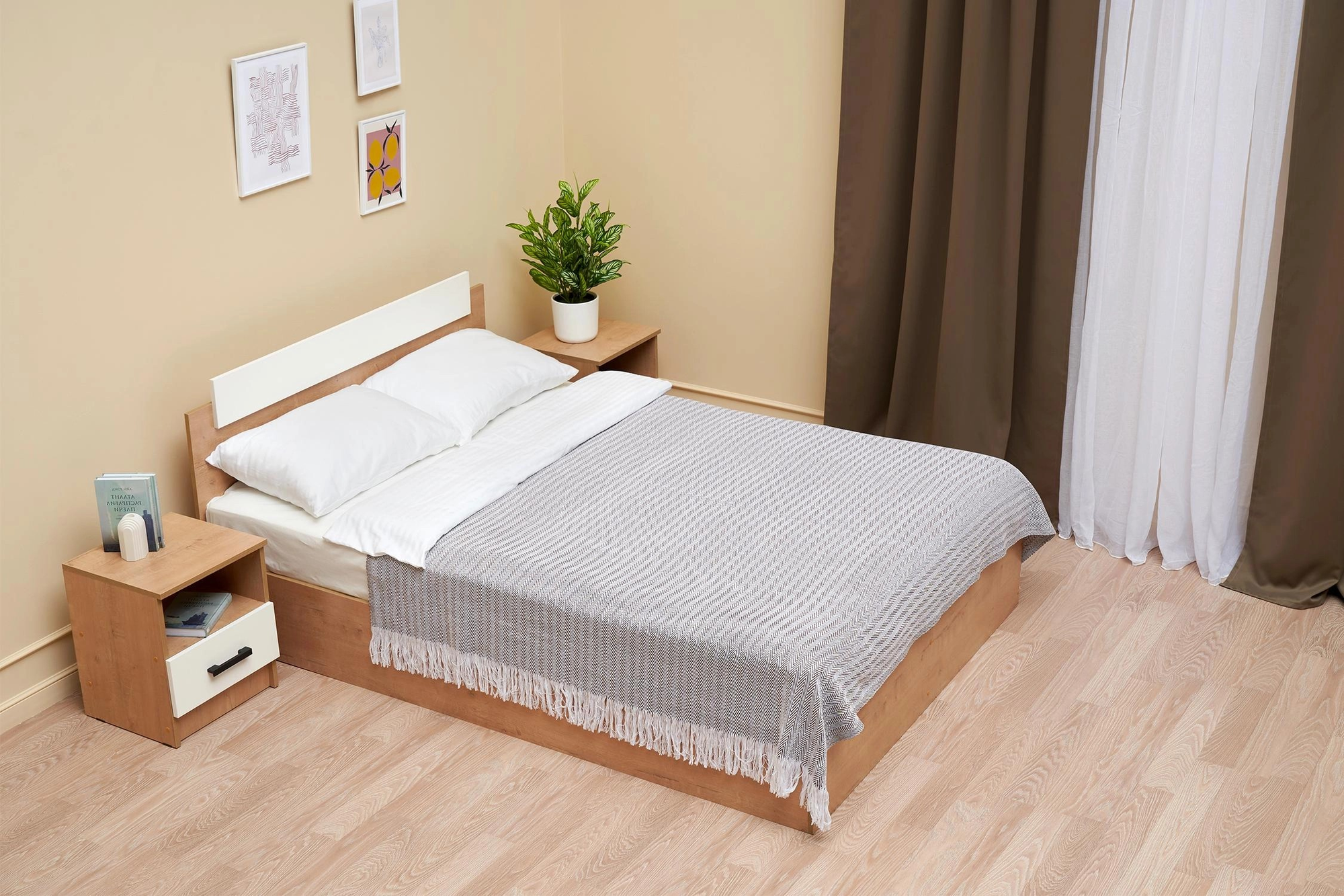 Кровать с ящиками 1800 с двумя тумбочками Камелия, цвет дуб сонома, ШхГхВ 296х217х78,2 см, спальное место 1800х2000 мм, без матраса, основание есть