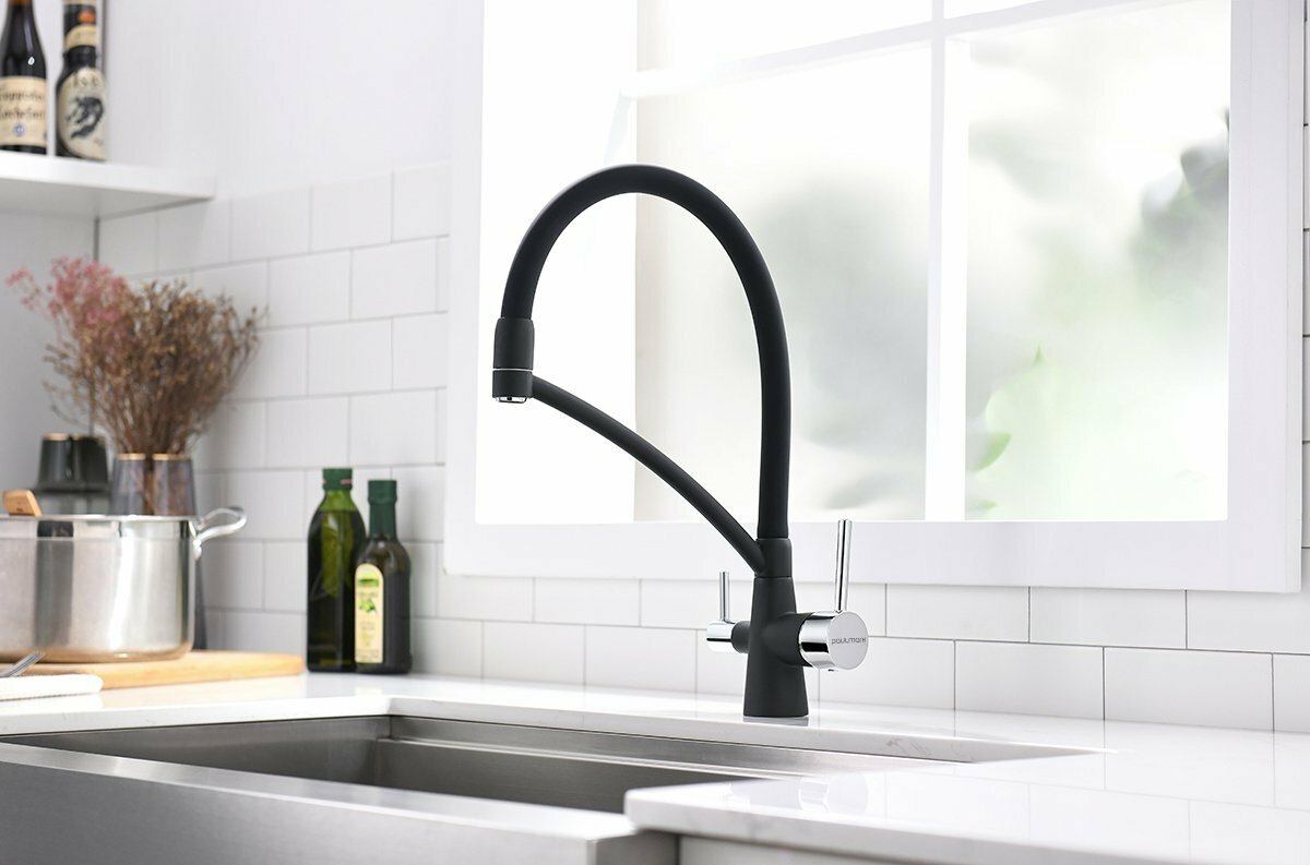 Смеситель для кухни с гибким изливом Paulmark SIEGEN, подключение к фильтру питьевой воды, двурычажный, поворотный, латунь / силикон, на мойку / столешницу, черный, Si213111-308
