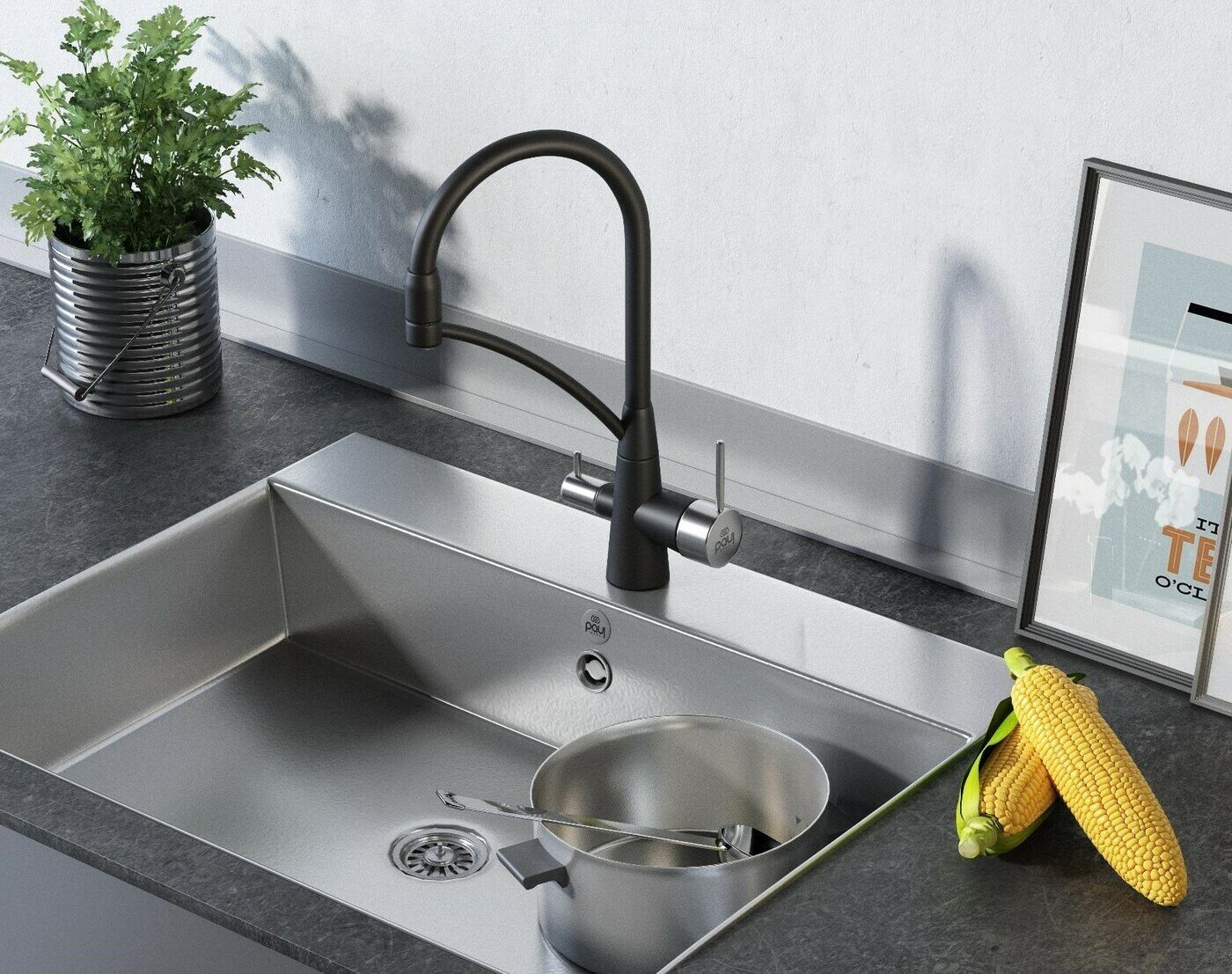 Смеситель для кухни с гибким изливом Paulmark SIEGEN, подключение к фильтру питьевой воды, двурычажный, поворотный, латунь / силикон, на мойку / столешницу, черный, Si213111-308