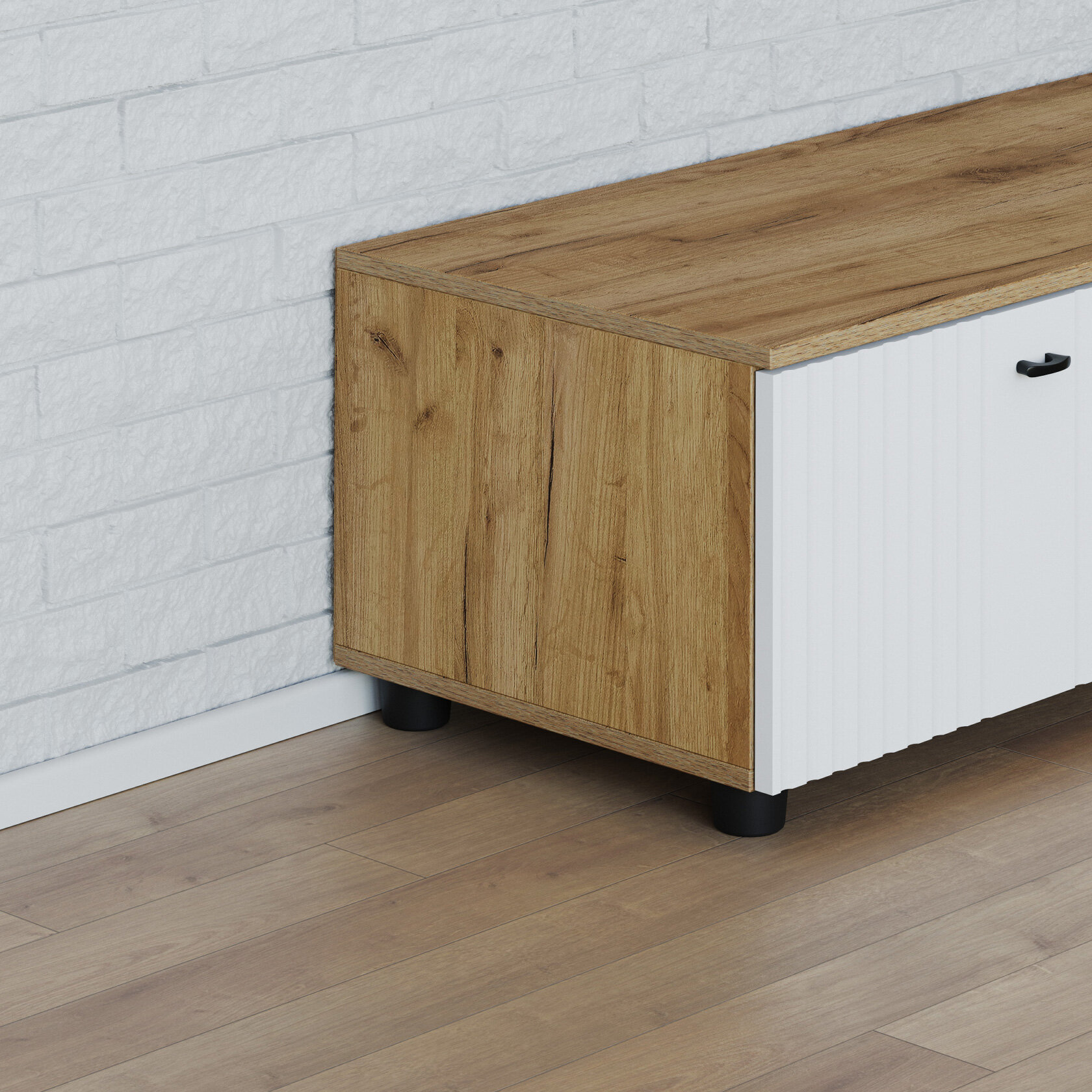PM.RU Тумба под телевизор напольная Ларенс ТВ с полками, с дверцами, закрытая, 160.1х41.8х36.8 см, Дуб золотой / Белый матовый