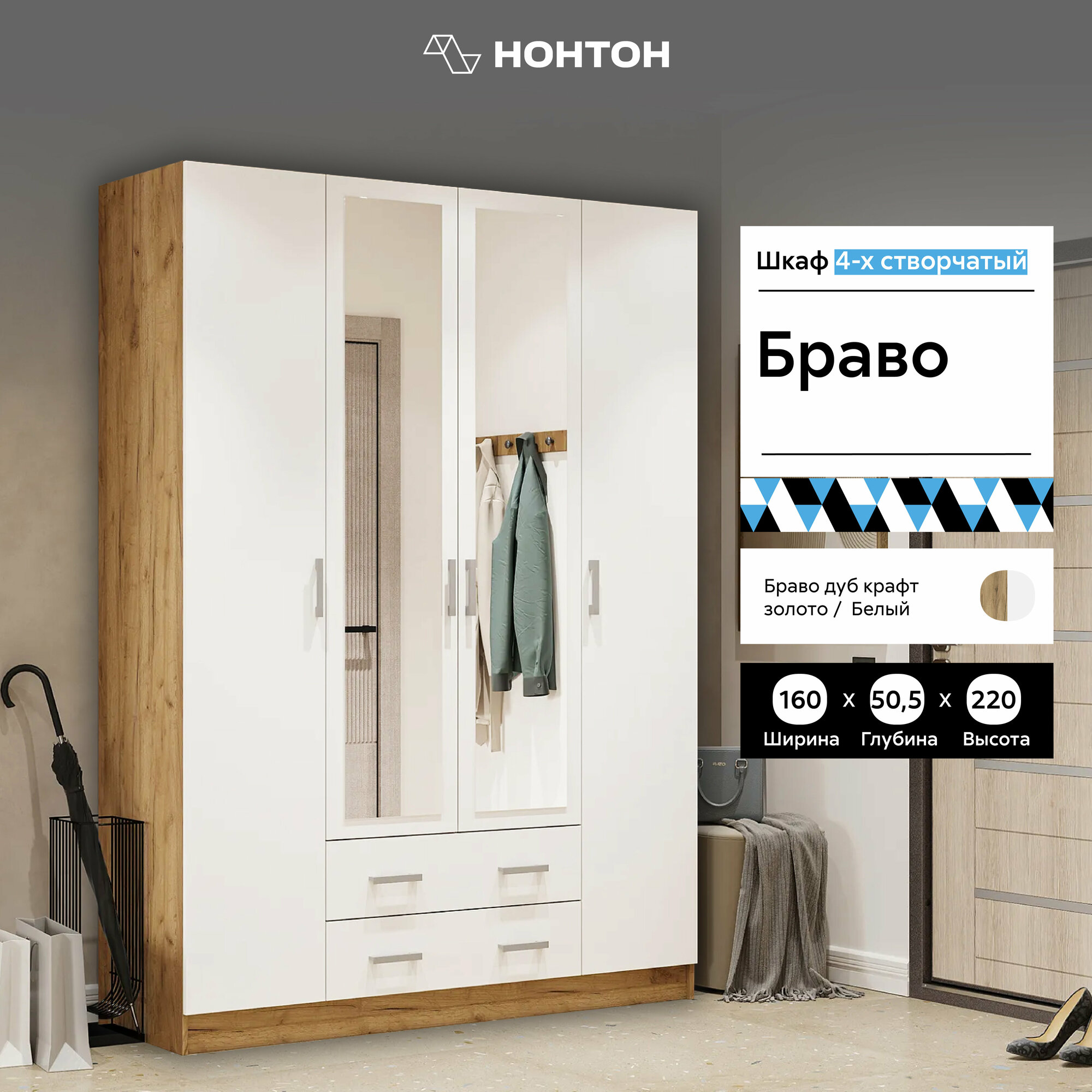 Шкаф 4-х створчатый Нонтон Браво дуб крафт золото / фасад белый 160x50.5x220 см