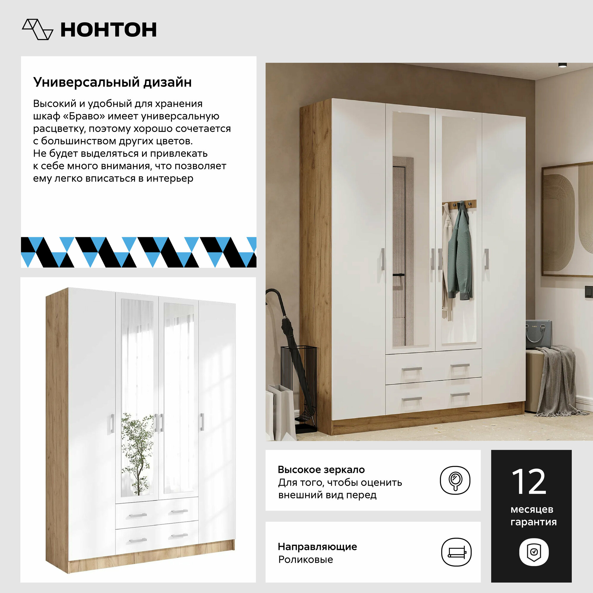 Шкаф для одежды с зеркалом и ящиками Нонтон Браво, дуб крафт золото / белый, 160 см интересное: