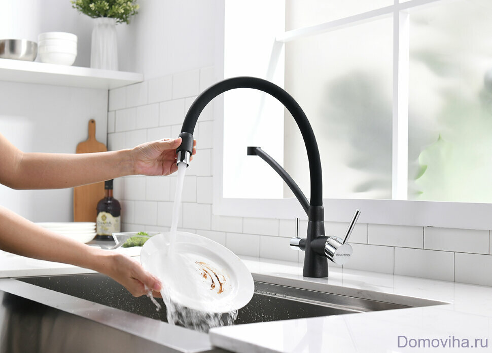 Смеситель для кухни с гибким изливом Paulmark SIEGEN, подключение к фильтру питьевой воды, двурычажный, поворотный, латунь / силикон, на мойку / столешницу, черный, Si213111-308