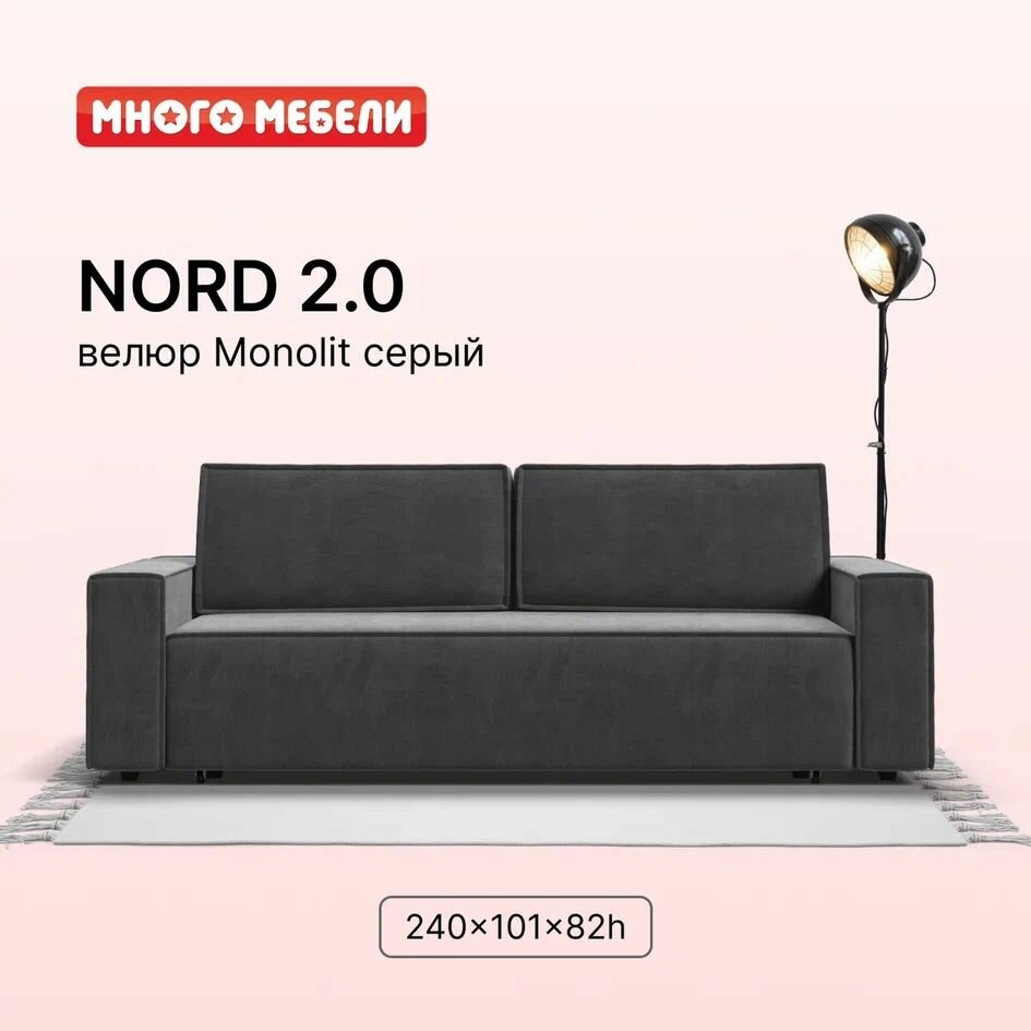 Диван-кровать Много мебели Nord 2.0, велюр Monolit серый, 240х101х82 см