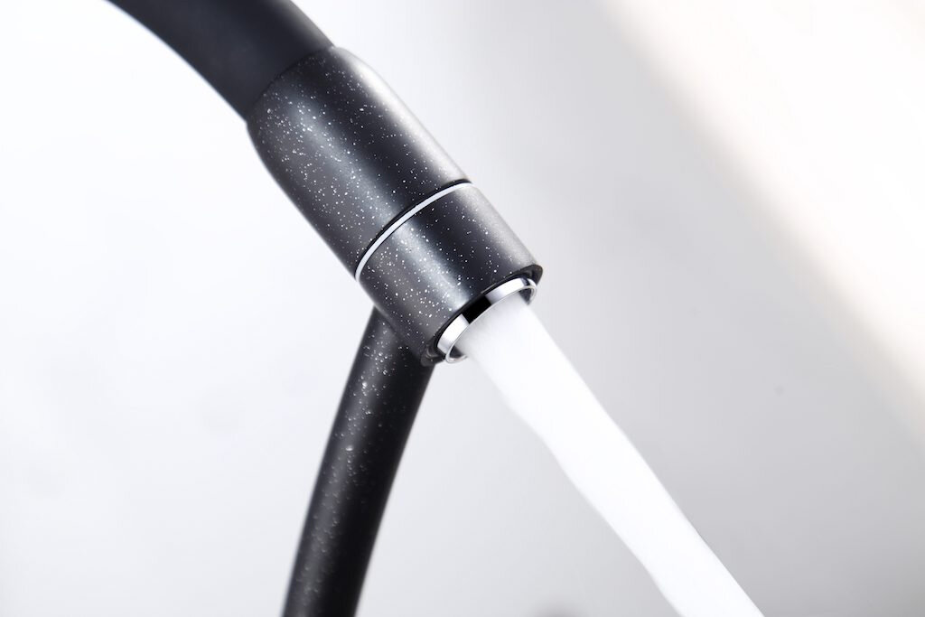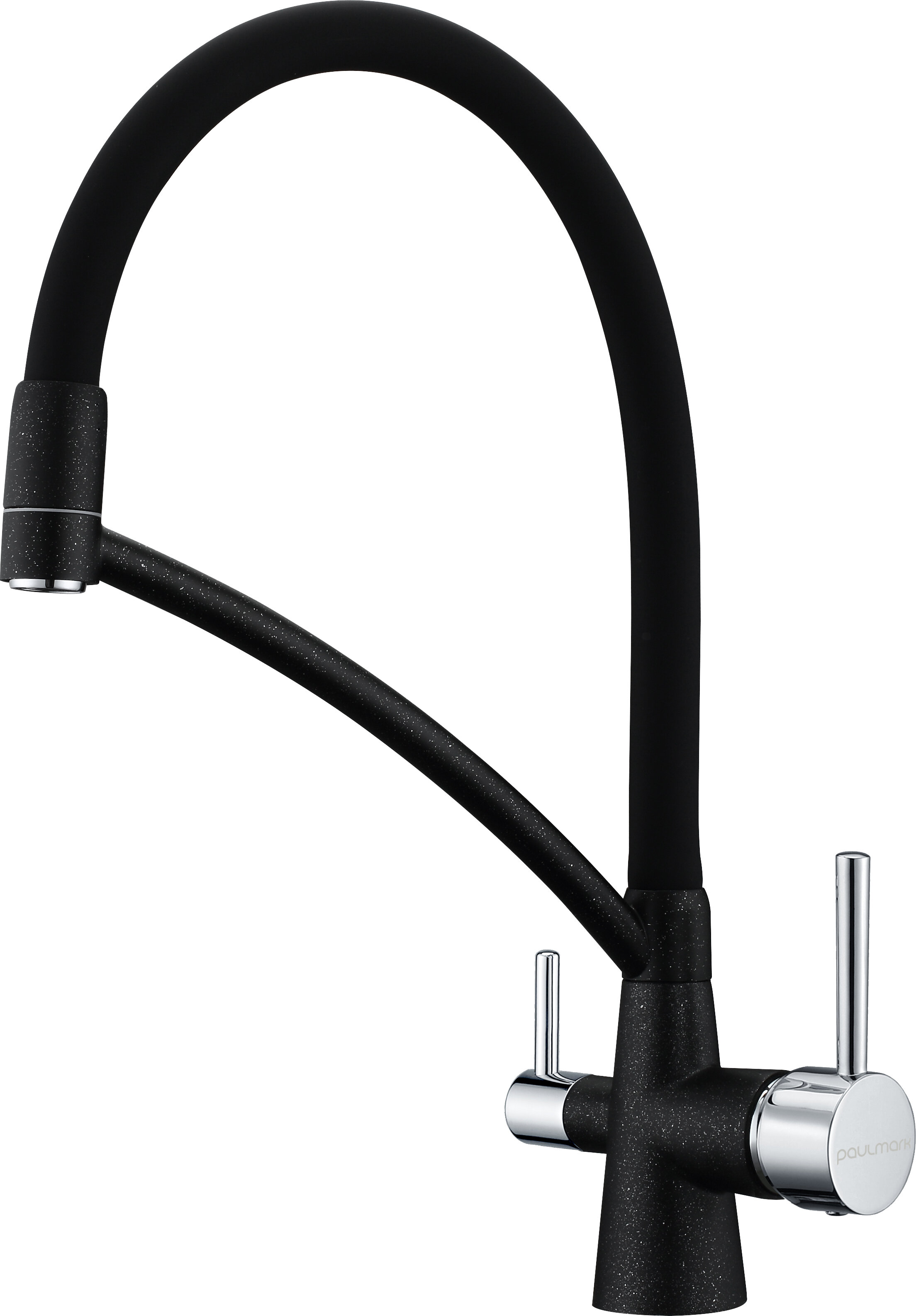 Смеситель для кухни с гибким изливом Paulmark SIEGEN, подключение к фильтру питьевой воды, двурычажный, поворотный, латунь / силикон, на мойку / столешницу, черный, Si213111-308