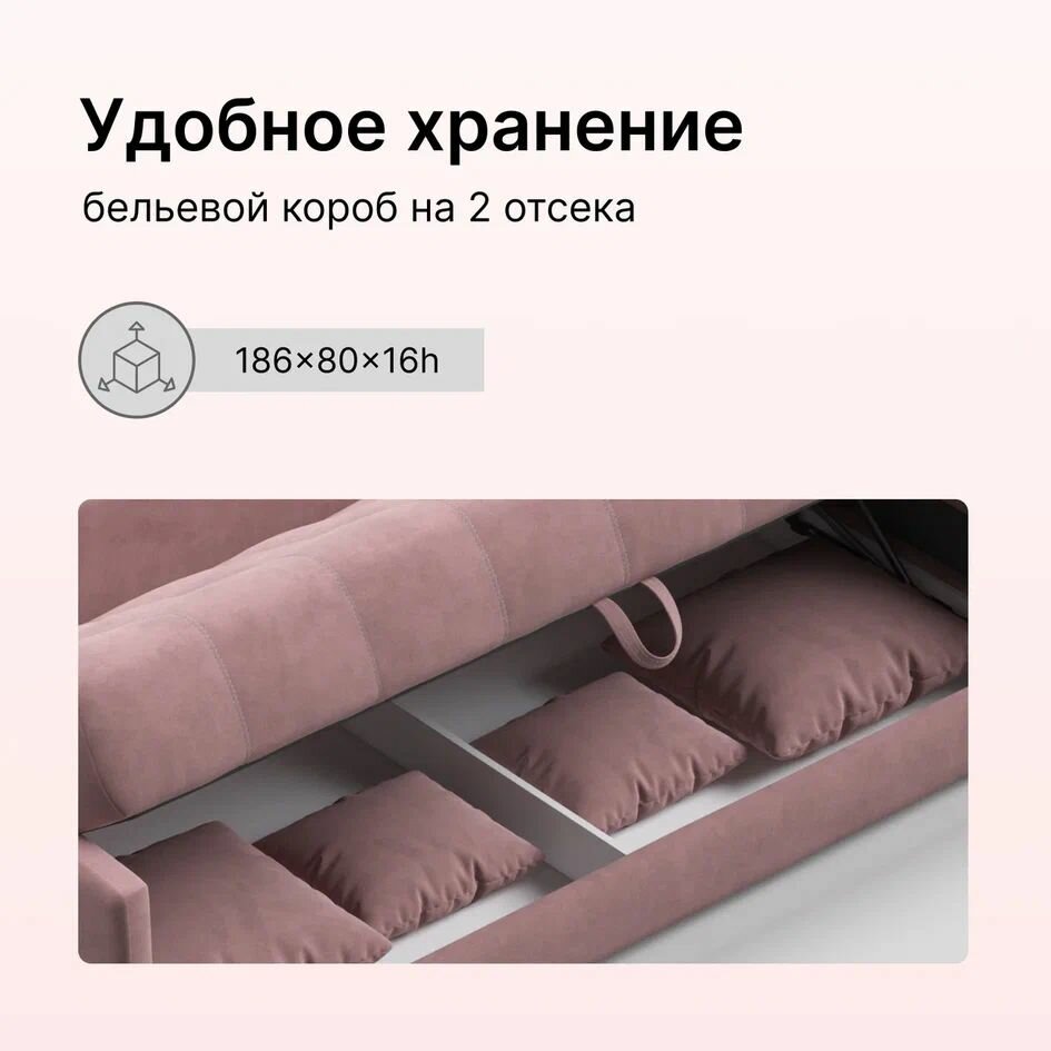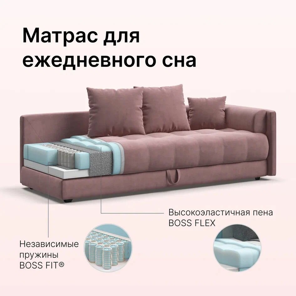 СохранитьОдноспальная тахта-диван с ящиком для хранения Boss, велюр Monolit розовый, 203x93x61 см, Много Мебели интересное: