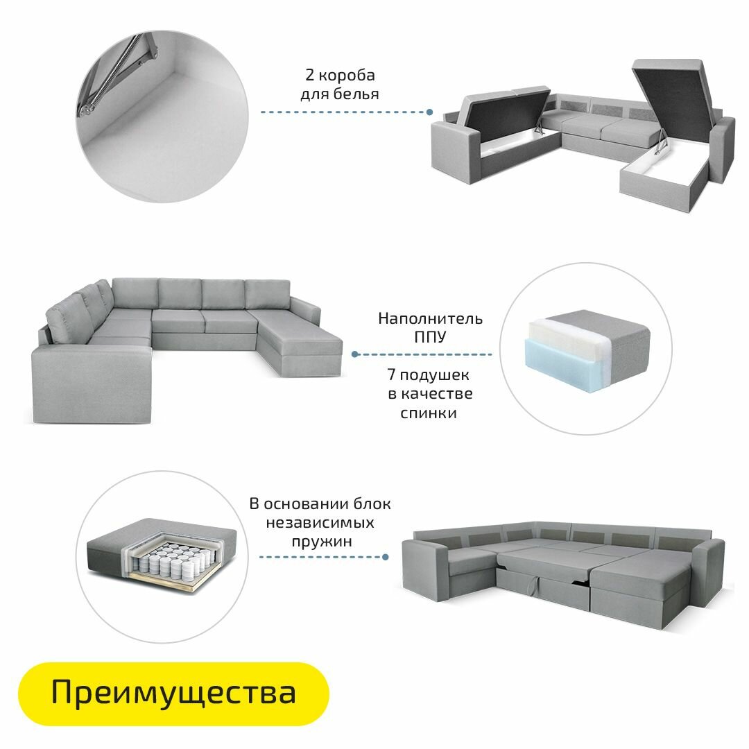 Диван угловой П-образный AH!DIVAN Кольдинг, 304х235х85, раскладной механизм дельфин, серый рогожка