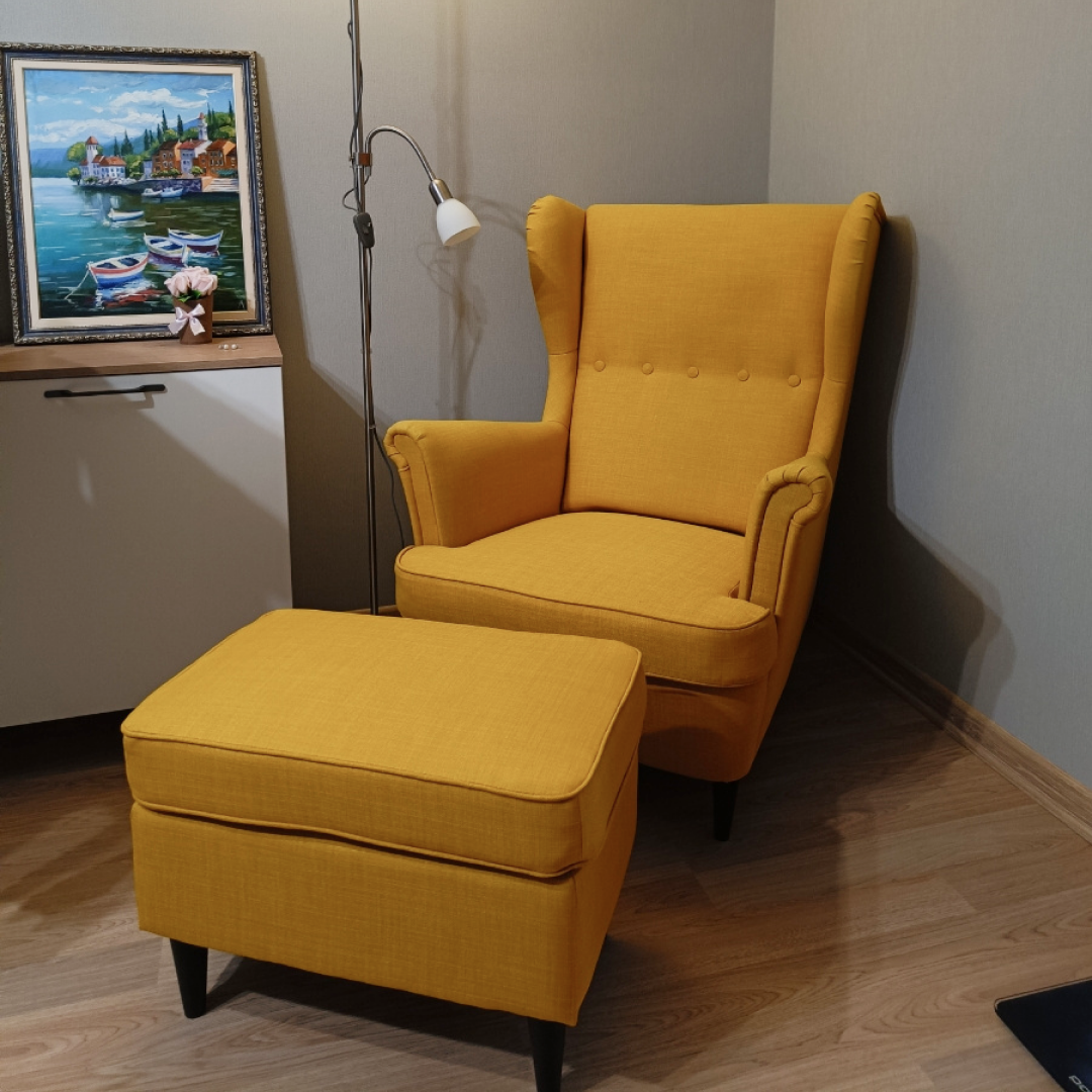 Кресло и пуфик икеа страндмон (стрэнд), рогожка, жёлтый