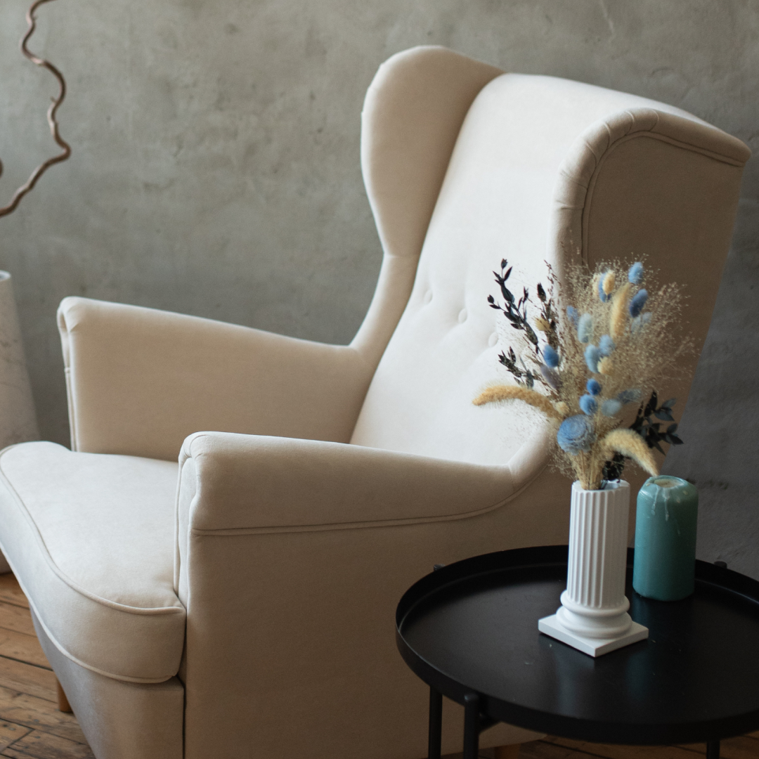 Мягкое кресло с высокой спинкой страндмон (стрэнд) ULTRA IVORY, велюр, слоновая кость