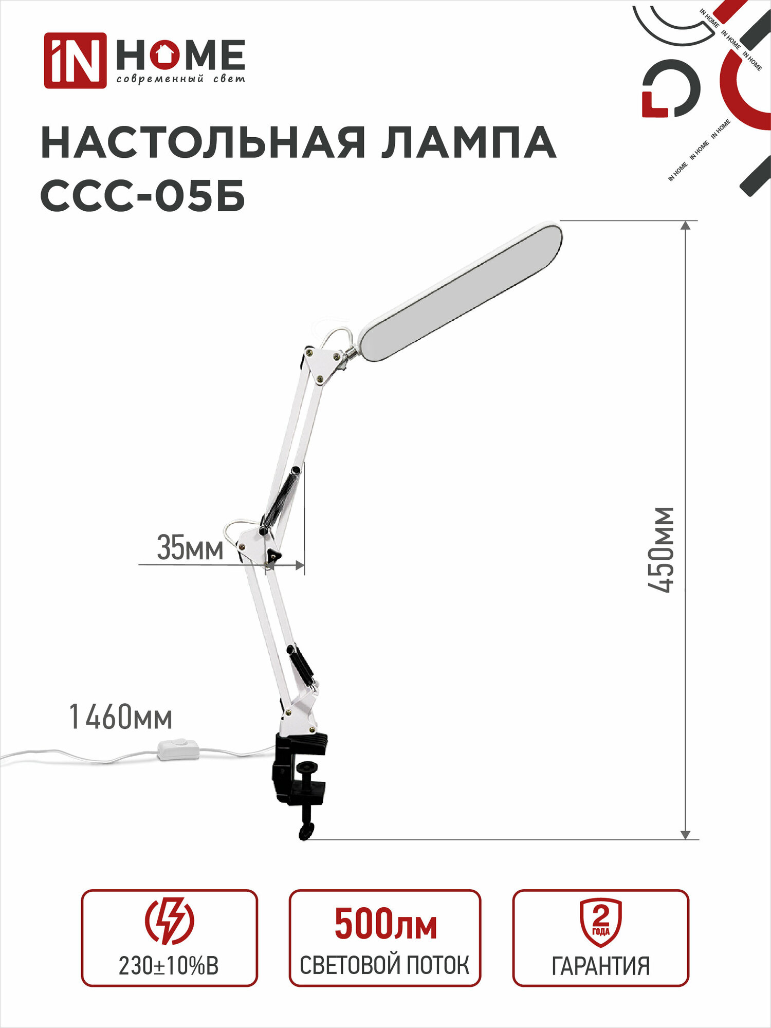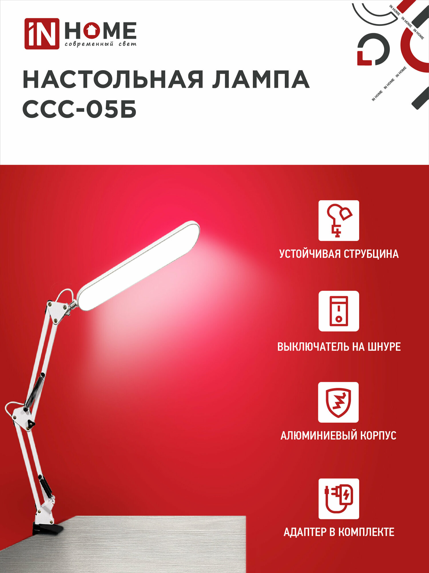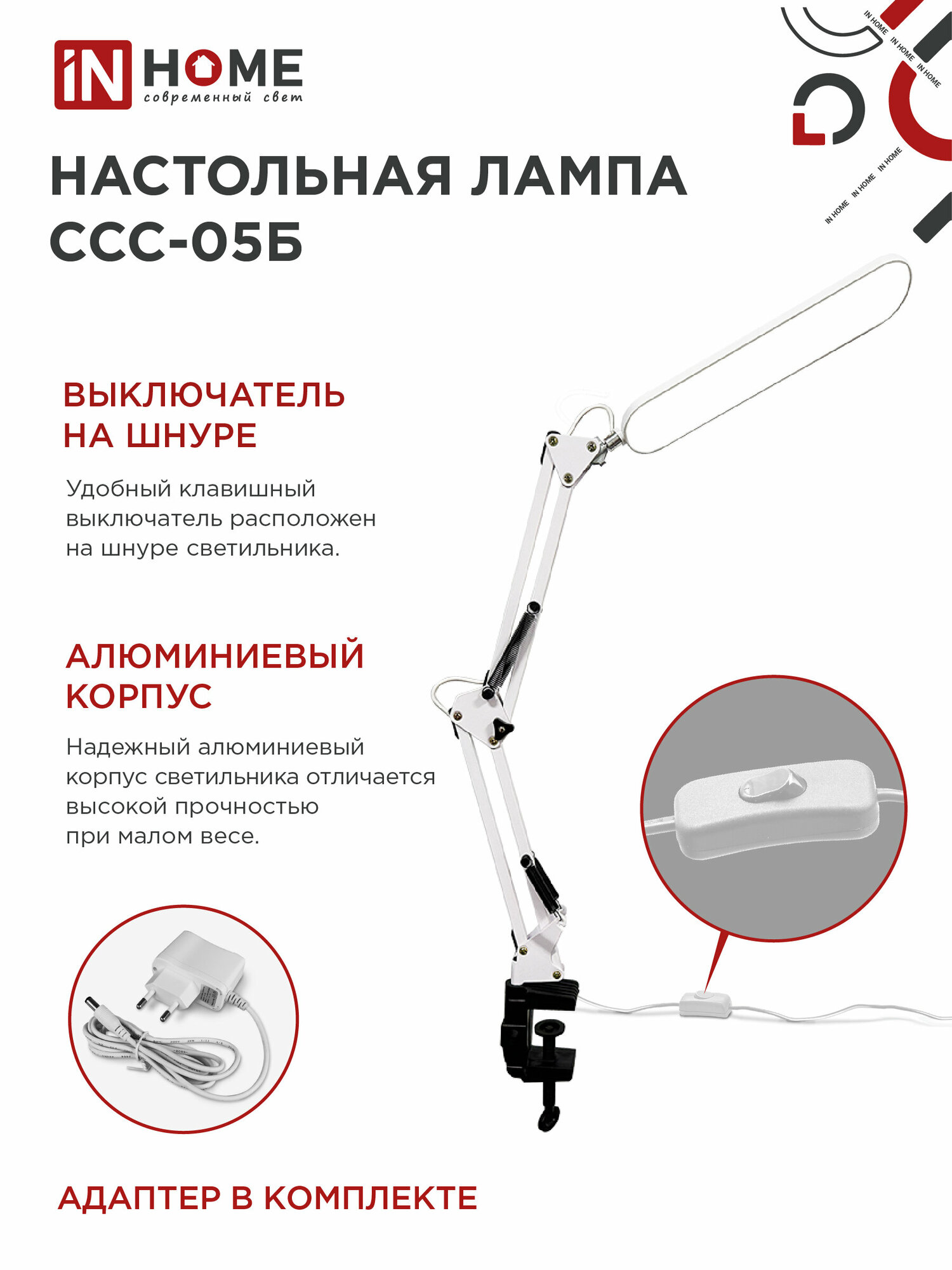 Светильник настольный светодиодный PLUS ССС-02Б 15Вт 3000-6500К 600Лм USB, с адаптером, струбцина белый IN HOME