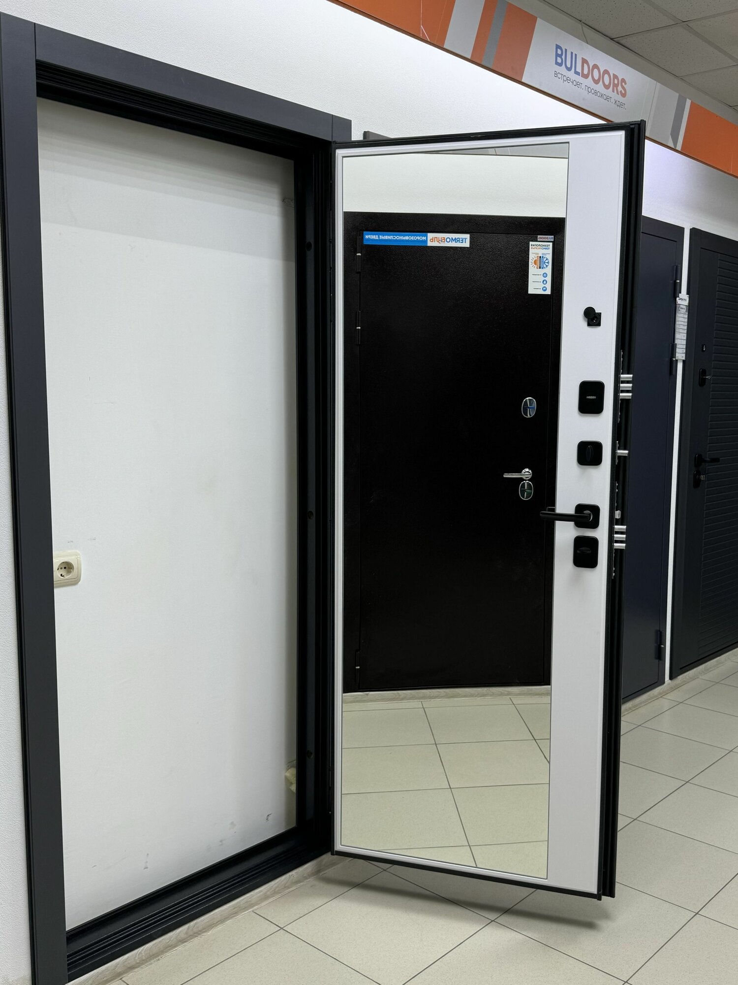СохранитьДверь входная металлическая квартирная бульдорс 90 РP 2050x860 Левая, Шагрень графит - Белый матовый с зеркалом интересное: