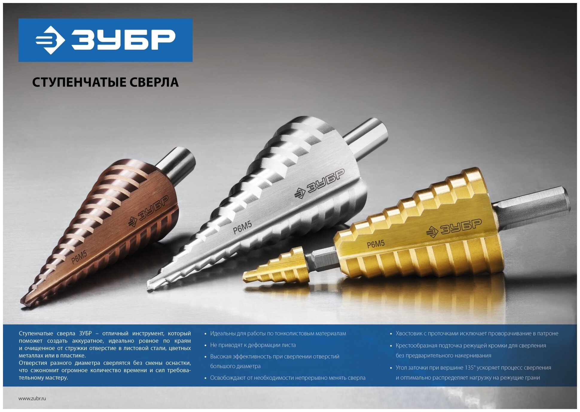 | Дополнительная информация | высота ступени 5 мм; материал сверла: быстрорежущая сталь Р6М5+ Co; диаметр: 4-30 мм; |