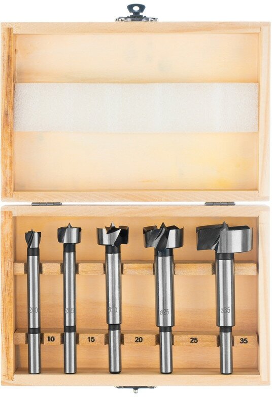 Набор сверл Форстнера по дереву, 10-15-20-25-35 мм, 5 шт, в деревянном боксе, цилиндрический хвостовик Sparta
