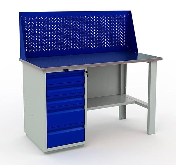 Купить Стол верстак слесарный металлический с тумбой с 5 ящиками, с экраном, 1400 мм, практик PROFI WT140. WD5/F1.010