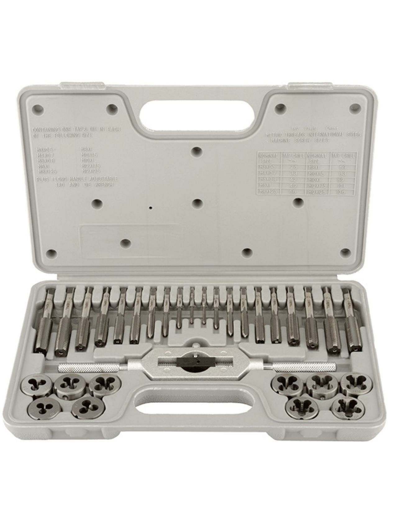 | Подробная комплектация | метчики и плашки для нарезания резьб М3х0,5, М4х0,7, М5х0,8, М6х1,0, М8х1,0, М8х1,25, М10х1,0, M10х1,5, М12х1,25, М12х1,75 мм. |