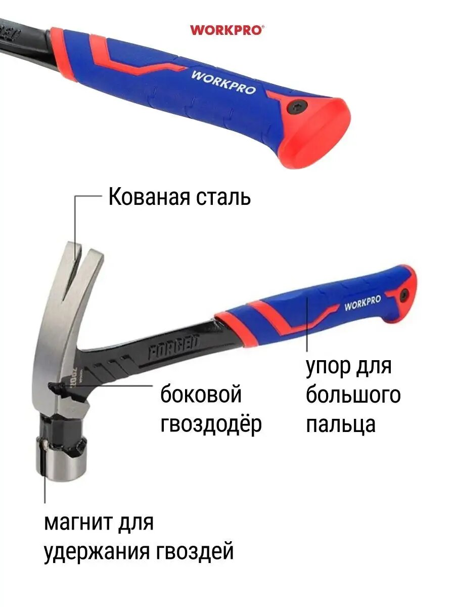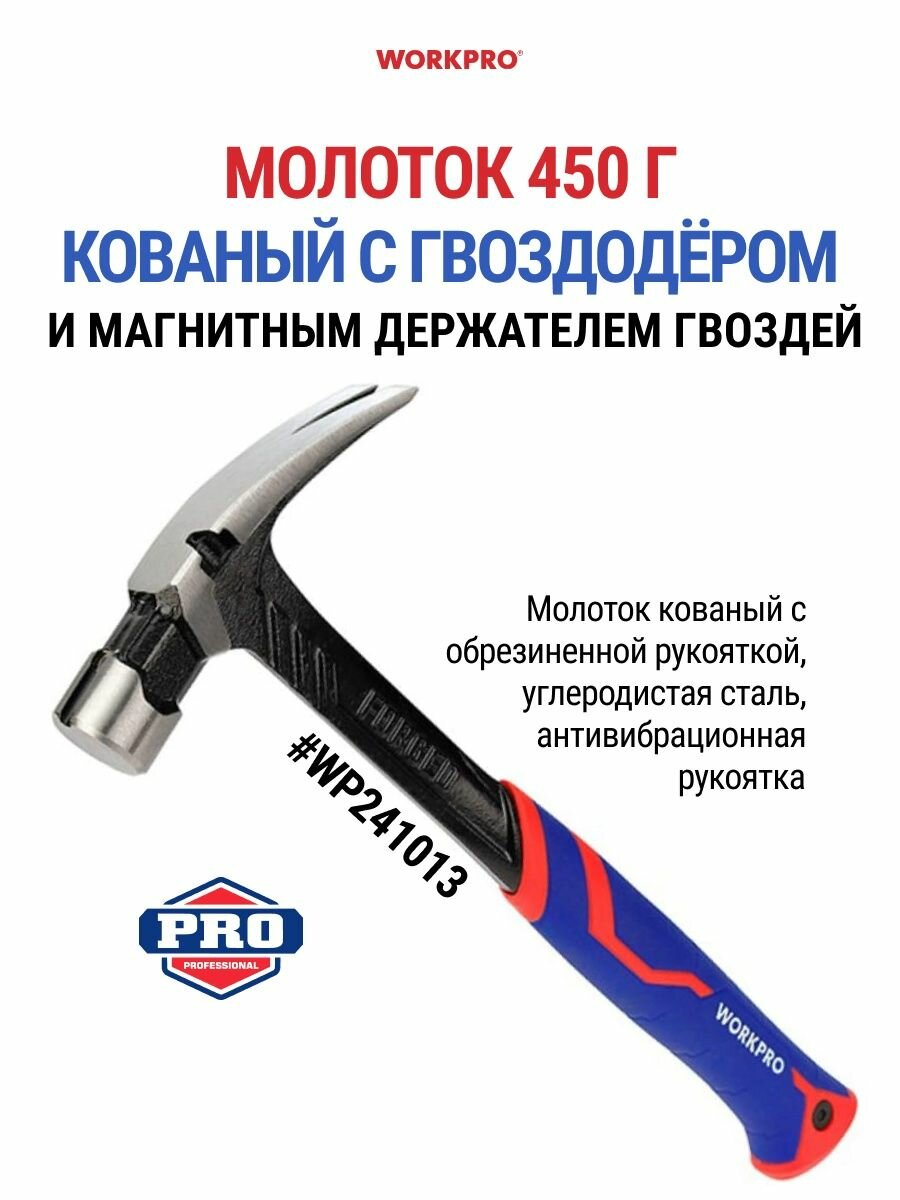 Молоток кованый с гвоздодёром и магн. держателем WP241014, WORKPRO #WP241014