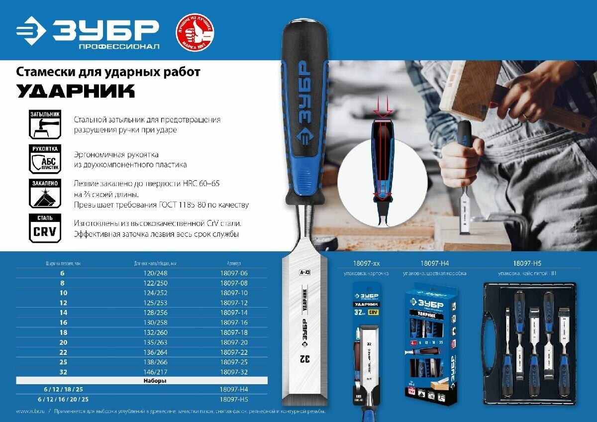 Ниже Вы можете прочитать отзывы на Стамеска-долото ЗУБР 18097-32_z01 Ударник с двухкомпонентной рукояткой, 32 мм, ознакомится с подробными характеристиками, посмотреть интересные обзоры и фотографии на Стамеска-долото ЗУБР 18097-32_z01 Ударник с двухкомпонентной рукояткой, 32 мм.
