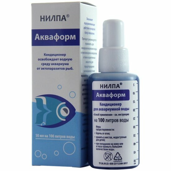 | Дополнительная информация | Кондиционер НИЛПА®«Акваформ» можно использовать в ёмкостях для инкубирования икры рыб в течение первых суток её развития, в целях предотвращения поражения паразитическими грибками. Рекомендованная дозировка составляет 50 мл на 5 литров воды, экспозиция 10-15 мин, воду во время обработки следует аэрировать. |
