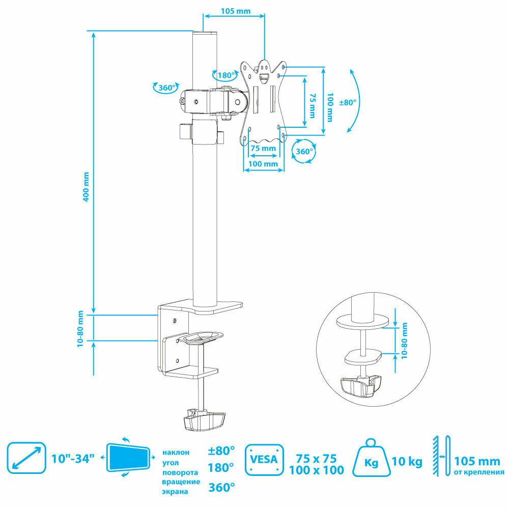 Кронштейн для мониторов Kromax CASPER-505 черный 10"-34" макс.10кг настольный поворот и наклон