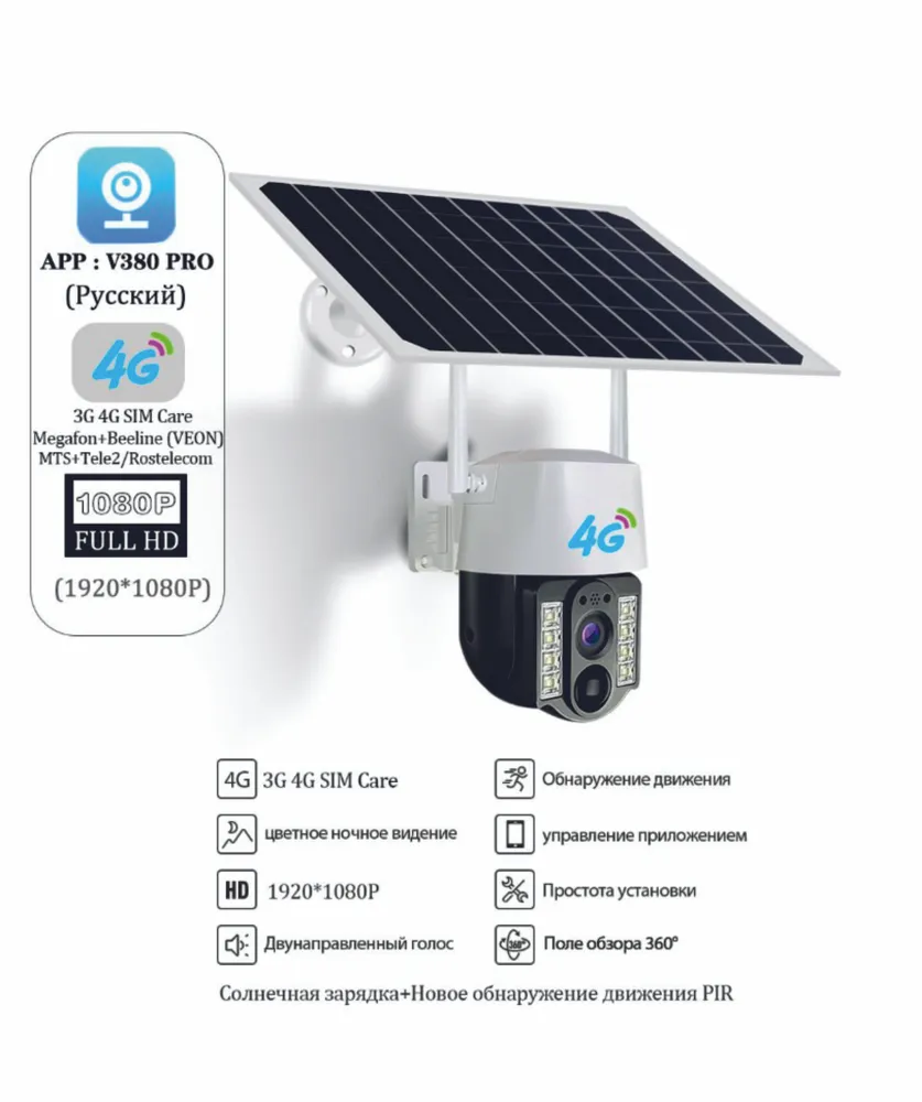 Уличная поворотная Wi-Fi камера на солнечной батареи с SIM-картой, TF (SD картой)