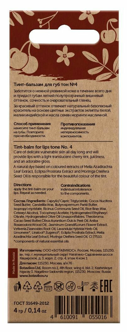 Тинт-бальзам для губ, тон №4, Сочная вишня, 4 гр, BOTAVIKOS