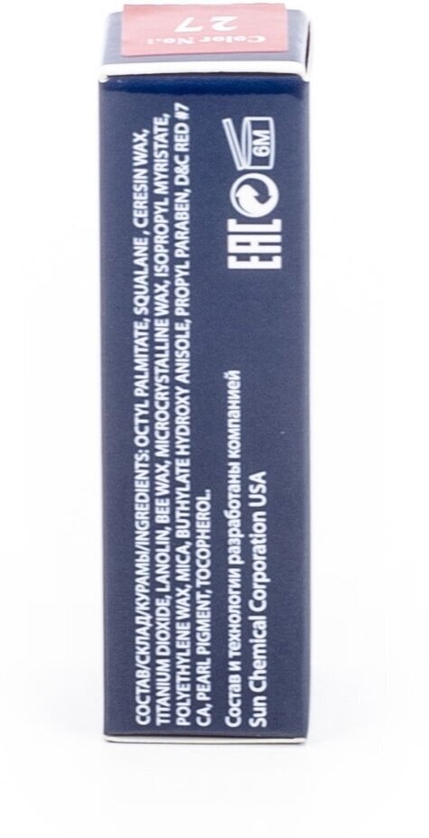 | Состав | vасло касторовое, канделильский воск, карнаубский воск, микрокристаллический воск, церезиновый воск, изопропил палмитат, октилдодецанол, вазелин, миристил, миристат, пропилпарабен. |