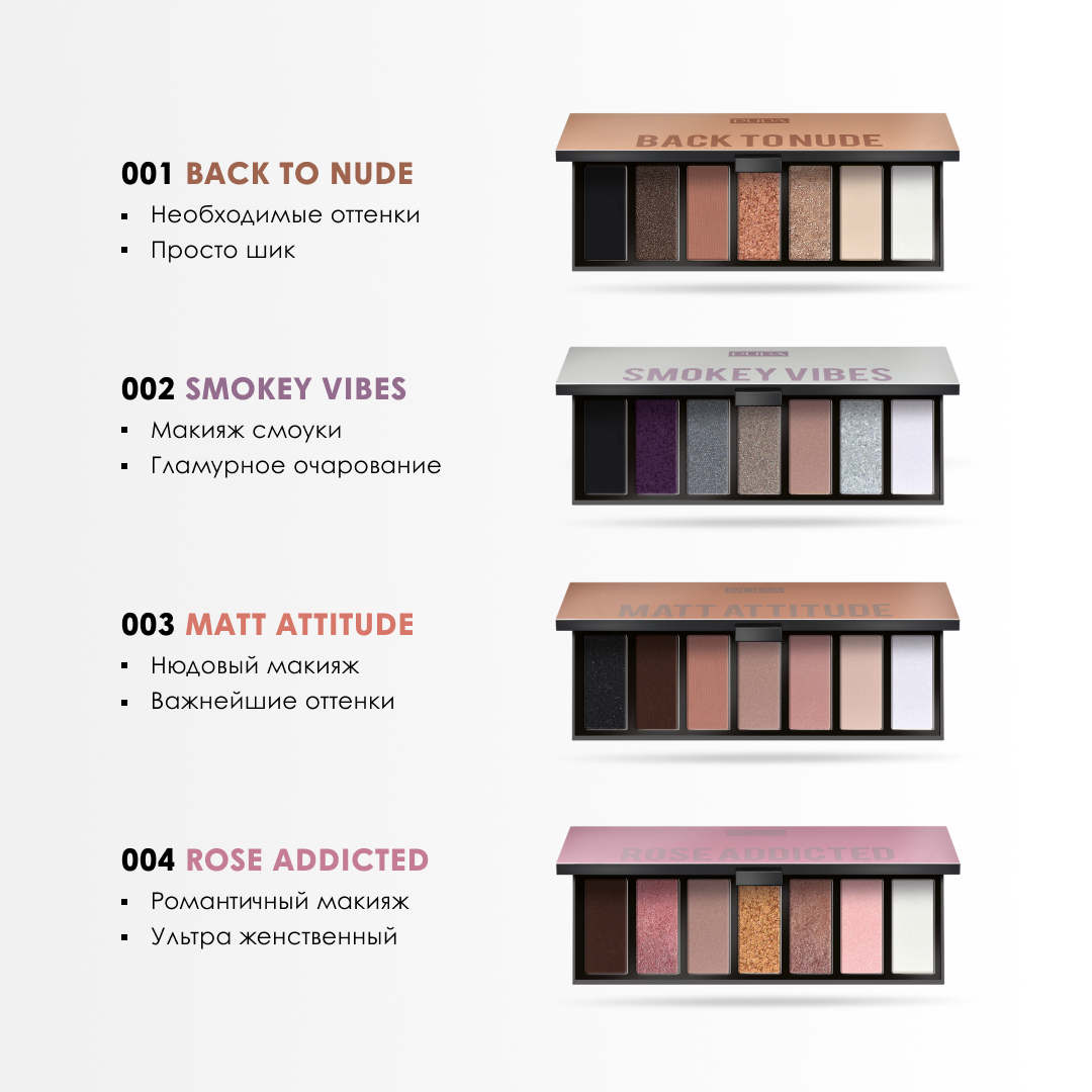 | Цвет товара | 001 back to nude, 002 smokey vibes, 003 matt attitude, 004 rose addicted |