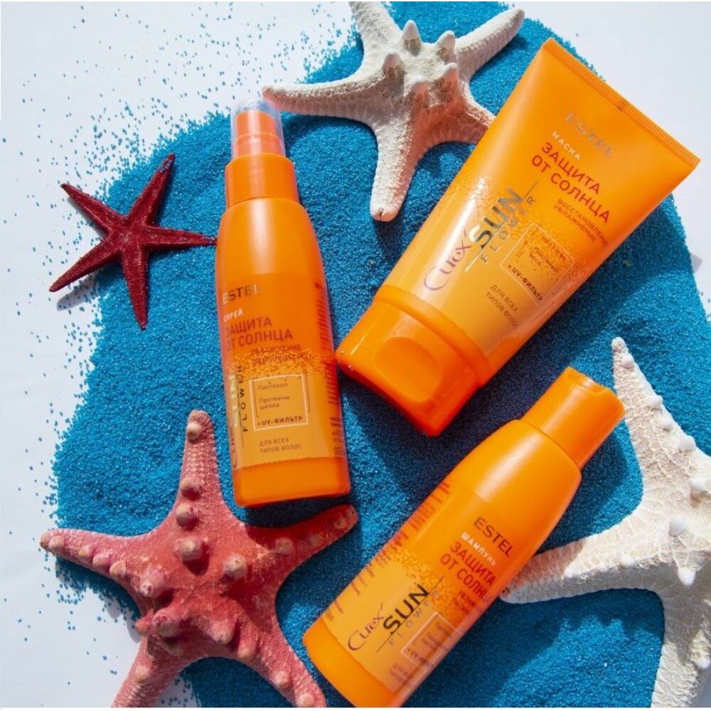 | Способ применения | шампунь: нанесите на влажные волосы, хорошо вспеньте массажными движениями 1-2 минуты, тщательно смойте; спрей: распылить на чистые сухие или влажные волосы во или во время пребывания на солнце или в солярии, не смывать; маска: нанести маску на чистые влажные волосы, массирующими движениями равномерно распределить по всей длине, оставить на 5-10 минут, затем тщательно смыть |