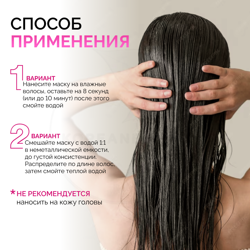 | Способ применения | необходимо смешать одну часть маски и одну часть холодной воды. При взаимодействии смесь превратится в гелеобразную кашицу. Получившуюся смесь нанести на волосы после шампуня на 8-10 секунд (допускается оставлять маску на волосах на 3-5 минут, при сильно поврежденных волосах). Смыть |