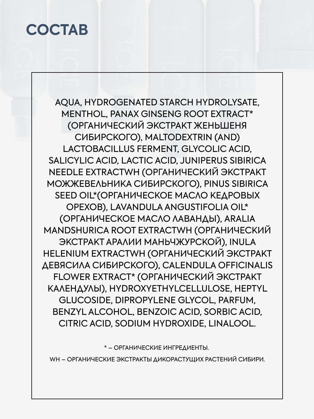 | Состав | Aqua, Hydrogenated Starch Hydrolysate, Menthol, Panax Ginseng Root Extract* (органический экстракт женьшеня сибирского), Maltodextrin (and) Lactobacillus Ferment, Glycolic acid, Salicylic Acid, Lactic Acid, Juniperus Sibirica Needle Extractwh (органический экстракт можжевельника сибирского), Pinus Sibirica Seed Oil*(органическое масло кедровых орехов), Lavandula Angustifolia Oil* (органическое масло лаванды), Aralia Mandshurica Root Extractwh (органический экстракт аралии маньчжурской), Inula Helenium Extractwh (органический экстракт девясила сибирского), Calendula Officinalis Flower Extract* (органический экстракт календулы), Hydroxyethylcellulose, Heptyl Glucoside, Dipropylene Glycol, Parfum, Benzyl Alcohol, Benzoic Acid, Sorbic Acid, Citric Acid, Sodium Hydroxide, Linalool. (*) – органические ингредиенты. (WH) – органические экстракты дикорастущих растений Сибири. |