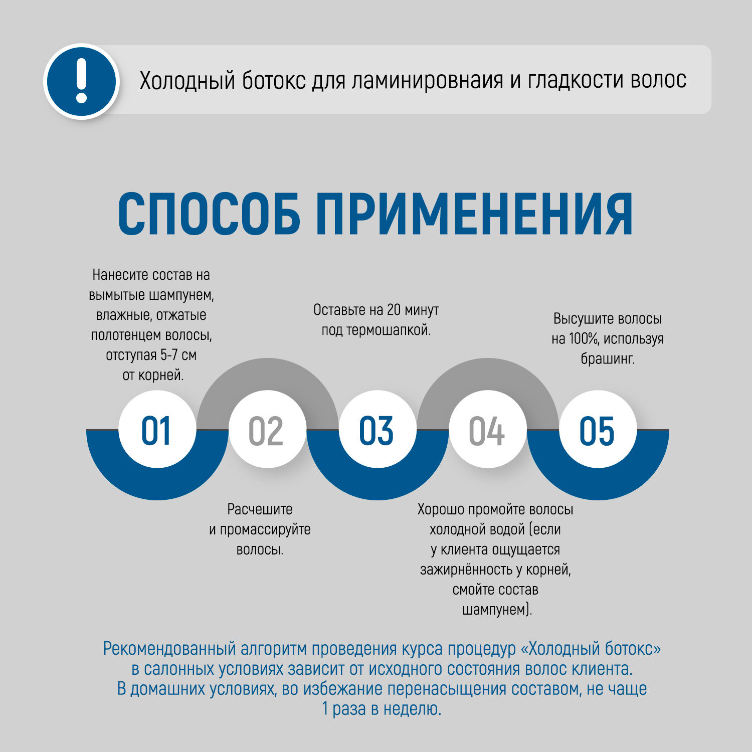 | Способ применения | "Подходит для профессионального и домашнего использования. Способ применения: 1. Нанесите состав на вымытые шампунем, влажные, отжатые полотенцем волосы, отступая 5-7 см от корней. Расчешите и промассируйте волосы. 2. Оставьте на 20 минут под термошапкой. 3. Промойте волосы холодной водой (в течение 10 секунд тонкие волосы, густые следует промыть, только если на волосах осталось большое количество продукта). 4. Высушите волосы на 100%, используя брашинг. Рекомендованная схема проведения курса процедур «Холодный ботокс»: • Процедура • 7 дней • Процедура • 7 дней • Процедура • 14 дней • Процедура Повторите курс спустя 1,5-2 месяца." |
