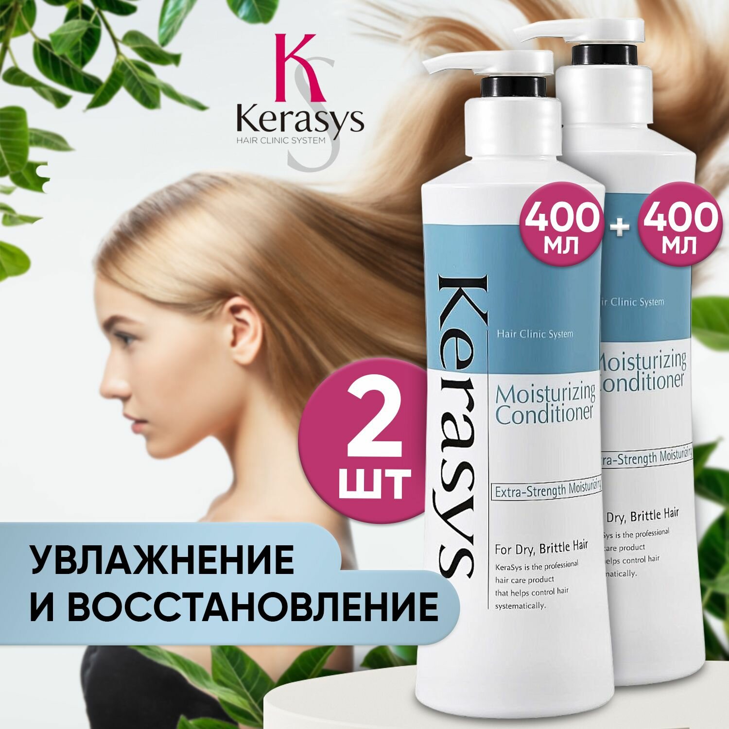 Купить Корейский кондиционер для волос Kerasys Moisturizing женский, 800 мл (2 уп по 400 мл), для ломких и сухих волос, питание и восстановление, защита цвета