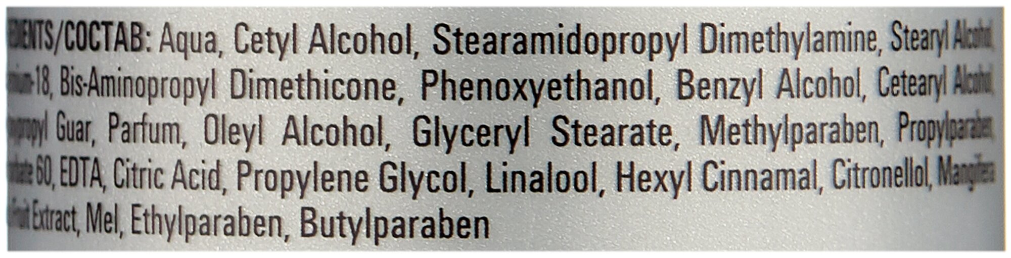 | Состав | aqua, cetyl alcohol, stearamidopropyl dimethylamine, stearyl alcohol, quaternium-18, bis-aminopropyl dimethicone, phenoxyethanol, benzyl alcohol, cetearyl alcohol, hydroxypropyl guar, parfum, oleyl alcohol, glyceryl stearate, methylparaben, propylparaben, polysorbate 60, edta, citric acid, propylene glycol, linalool, hexyl cinnamal, citronellol, mangifera indica fruit extract, mel, ethylparaben, butylparaben |