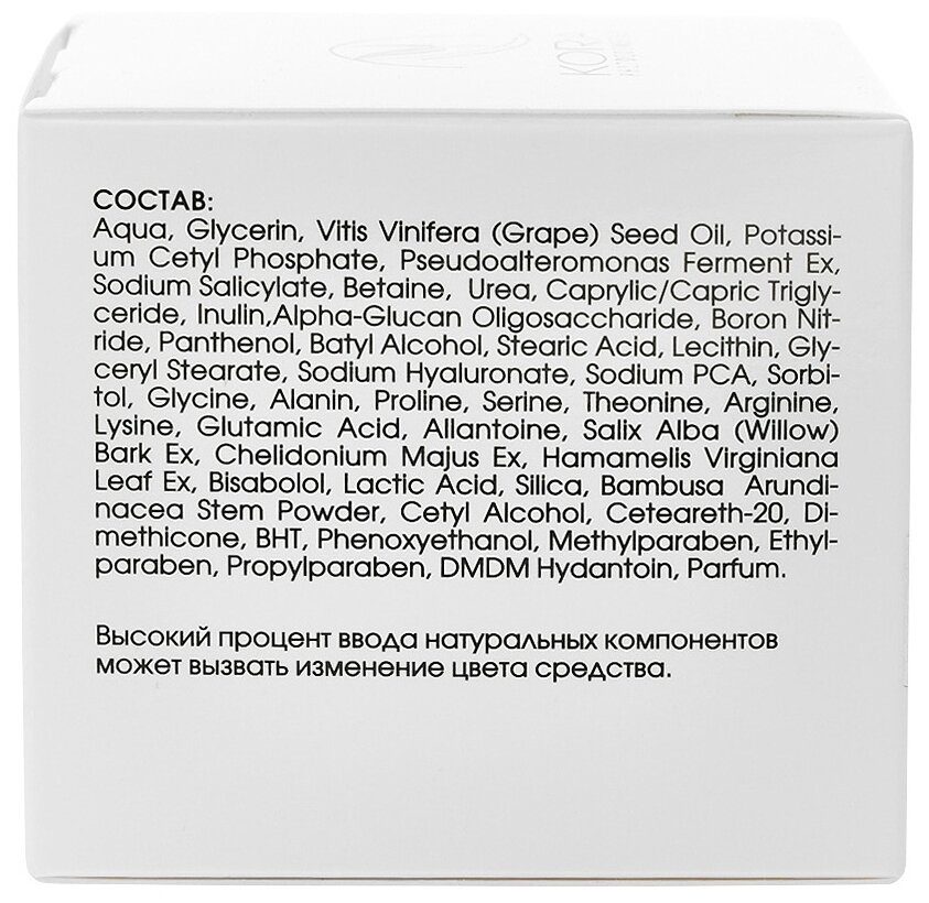 | Состав | Aqua, Glycerin, Vitis Vinifera (Grape) Seed Oil, Potassium Cetyl Phosphate, Pseudoalteromonas Ferment Extract, Sodium Salicylate, Betaine, Urea, Caprylic/Capric Triglyceride, Inulin,Alpha-glucan Oligosaccharide, Boron Nitride, Panthenol, Batyl Alcohol, Stearic Acid, Caprylic/Capric Triglyceride, Lecithin, Glyceryl Stearate, Sodium Hyaluronate, Sodium PCA, Sorbitol, Glycine, Alanin, Proline, Serine, Theonine, Arginine, Lysine, Glutamic Acid, Allantoine, Salix Alba (Willow) Bark Extract, Chelidonium Majus Extract, Hamamelis Virginiana Leaf Extract, Bisabolol, Lactic Acid, Silica, Bambusa Arundinacea Stem Powder, Cetyl Alcohol, Ceteareth-20, Dimethicone, ВНТ, Phenoxyethanol, Methylparaben, Ethylparaben, Propylparaben, DMDM Hydantoin, Parfum |