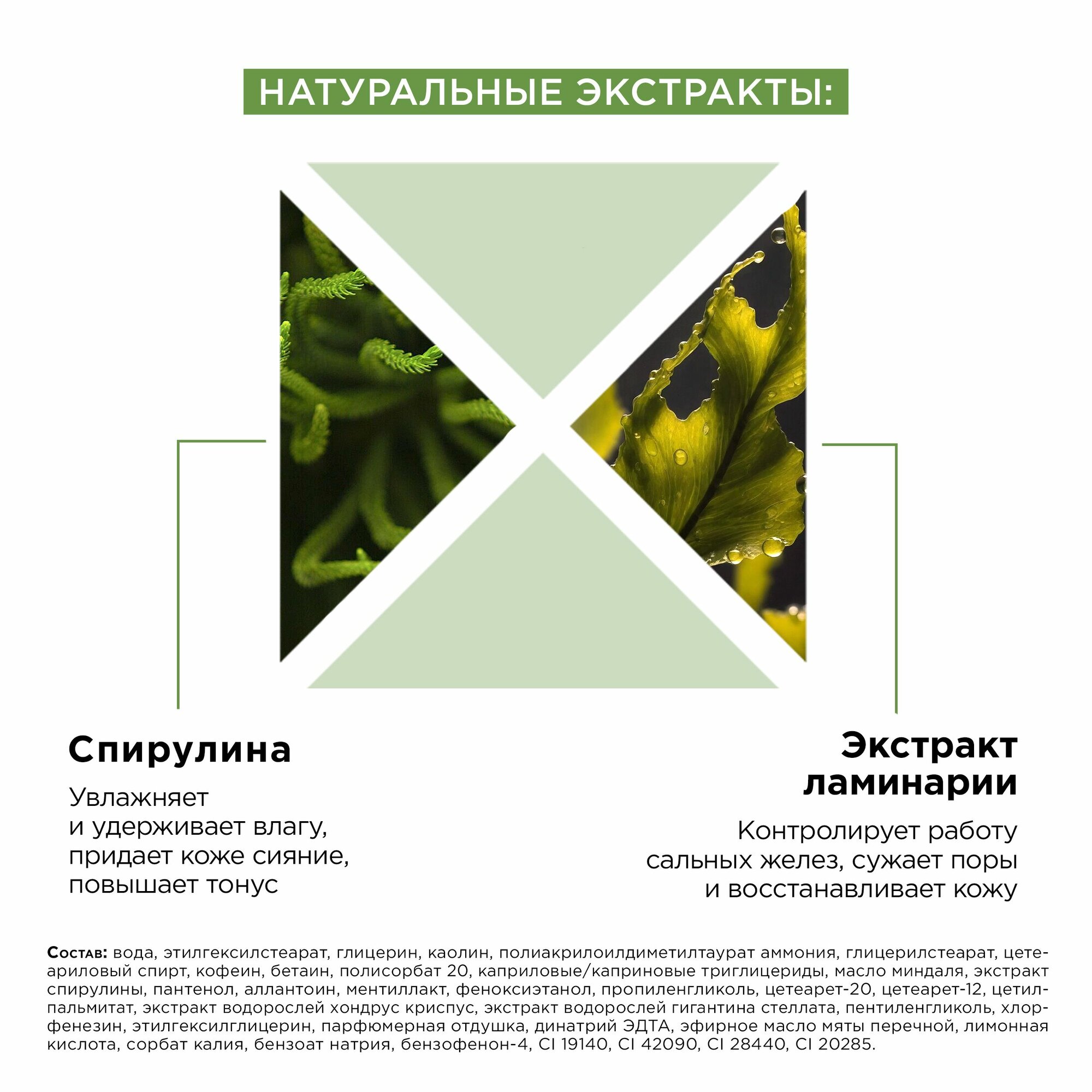 | Состав | Вода, этилгексилстеарат, глицерин, каолин, полиакрилоилдиметилтаурат аммония, глицерилстеарат, цетеариловый спирт, кофеин, бетаин, полисорбат 20, каприловые/каприновые триглицериды, масло миндаля, экстракт спирулины, пантенол, аллантоин, ментиллакт, феноксиэтанол, пропиленгликоль, цетеарет-20, цетеарет-12, цетилпальмитат, экстракт водорослей хондрус криспус, экстракт водорослей гигантина стеллата, пентиленгликоль, хлорфенезин, этилгексилглицерин, парфюмерная отдушка, динатрий ЭДТА, эфирное масло мяты перечной, лимонная кислота, сорбат калия, бензоат натрия, бензофенон-4, CI 19140, CI 42090, CI 28440, CI 20285. |