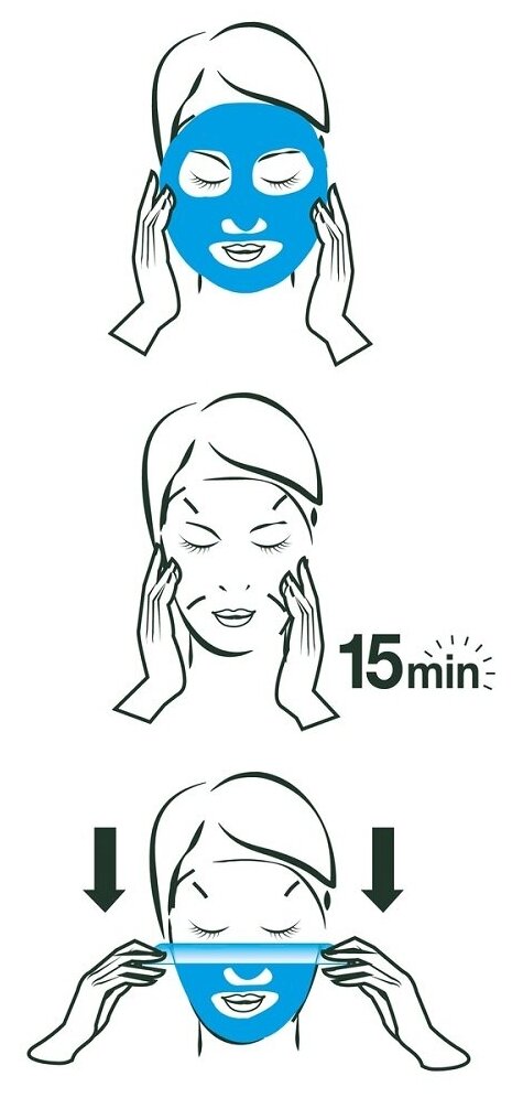| Способ применения | открыть маску, развернуть ее. Нанести на предварительно очищенное лицо белой стороной. Синяя защитная пленка должна быть на внешней стороне маски. Снять защитную пленку. Разгладить маску по контурам. Оставить на 15 минут. Маска прекрасно держится и не стесняет движений. Снять маску. Массажными движениями распределить остатки по коже или удалить с помощью ватного диска. Подходит для ежедневного применения. Идеально для применения вечером |