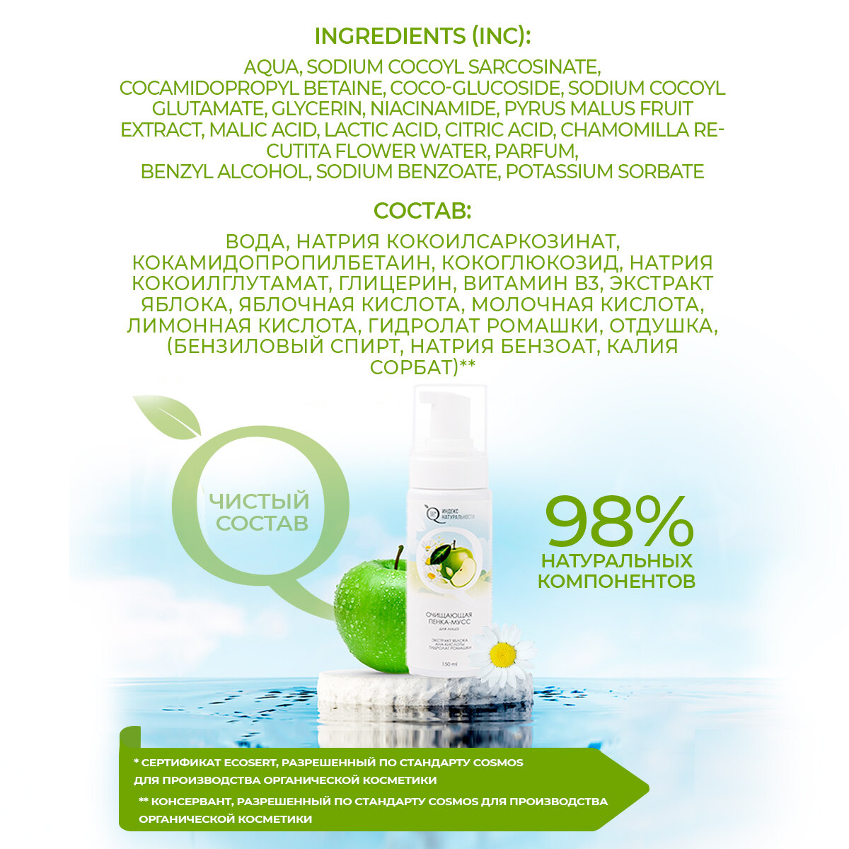 | Состав | Aqua (Вода), Sodium Cocoyl Sarcosinate (Натрия кокоилсаркозинат), Cocamidopropyl Betaine (Кокамидопропилбетаин), Coco-Glucoside (Кокоглюкозид), Sodium Cocoyl Glutamate (Натрия кокоилглутамат), Glycerin (Глицерин), Niacinamide (Витамин В3), Pyrus Malus Fruit Extract (Экстракт яблока), Malic Acid (Яблочная кислота), Lactic Acid (Молочная кислота), Citric Acid (Лимонная кислота), Chamomilla Recutita Flower Water (Гидролат ромашки), Parfum (Отдушка), Benzyl Alcohol, Sodium Benzoate, Potassium Sorbate (Бензиловый спирт, натрия бензоат, калия сорбат / Консервант, разрешённый по стандарту COSMOS для производства органической косметики). |