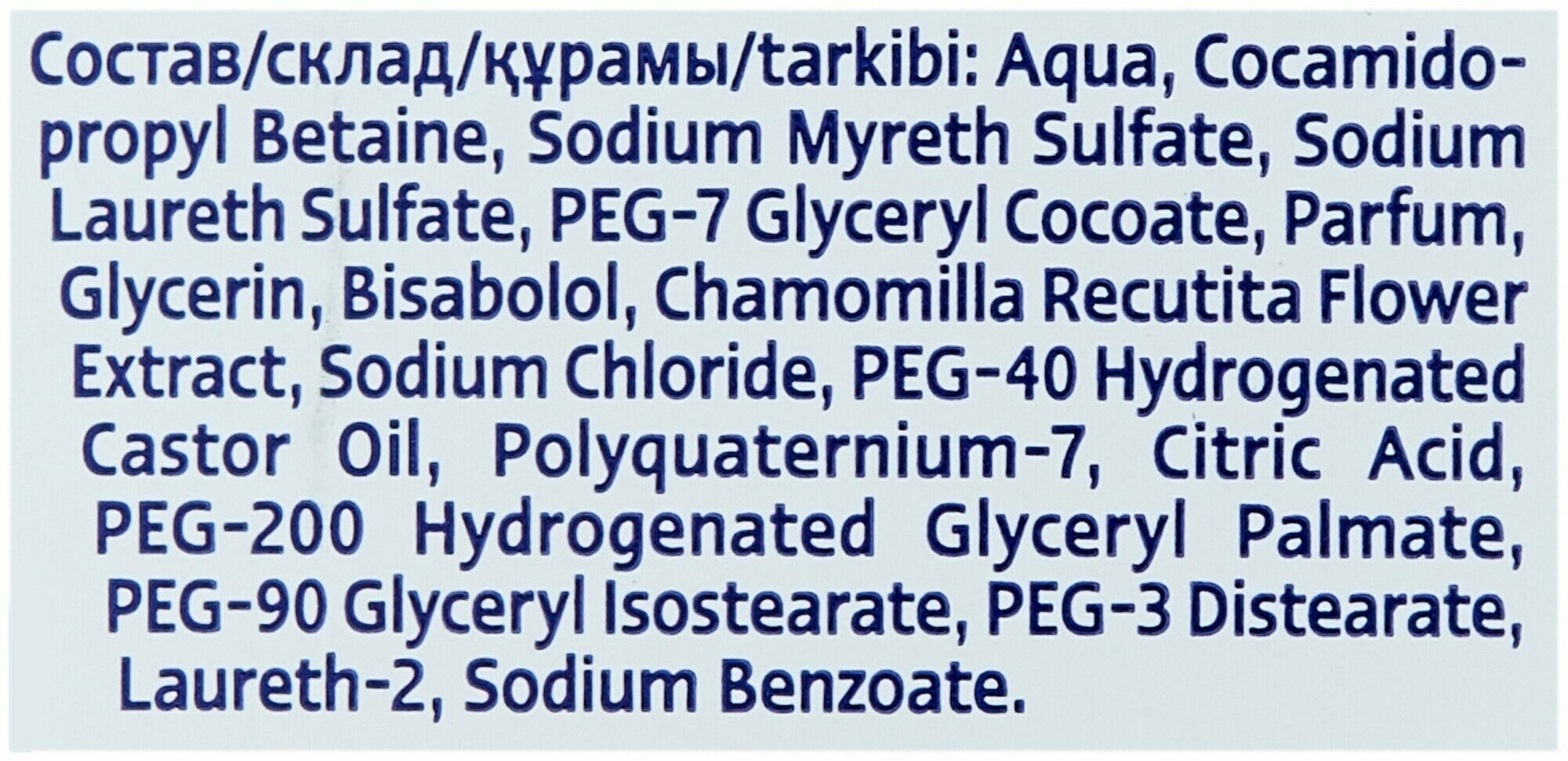 | Состав | aqua, cocamidopropyl betaine, sodium myreth sulfate, sodium laureth sulfate, peg-7 glyceryl cocoate, parfum, glycerin, bisabolol, chamomilla recutita flower extract, sodium chloride, peg-40 hydrogenated castor oil, polyquaternium-7, citric acid, peg-200 hydroдenated glyceryl palmate, peg-90 glyceryl isostearate, peg-3 distearate, laureth-2, sodium benzoate |