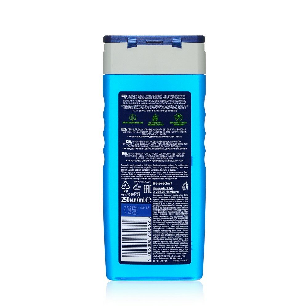 Гель для душа мужской NIVEA Men 2в1 Пробуждающий для тела и волос с морскими минералами, 250 мл х 3 шт