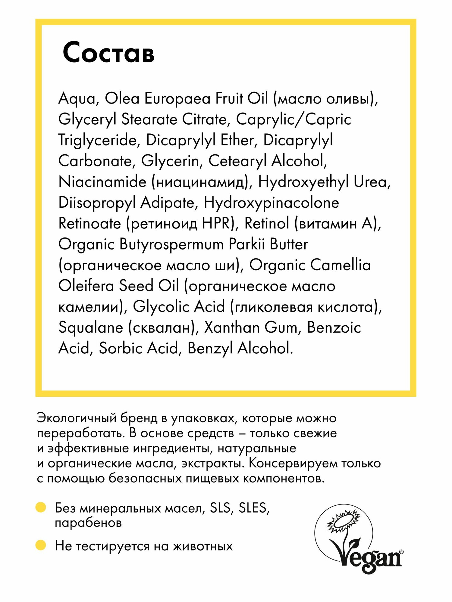 | Состав | Aqua, Olea Europaea Fruit Oil (масло оливы), Glyceryl Stearate Citrate, Caprylic/Capric Triglyceride, Dicaprylyl Ether, Dicaprylyl Carbonate, Glycerin, Cetearyl Alcohol, Niacinamide (ниацинамид), Hydroxyethyl Urea, Diisopropyl Adipate, Hydroxypinacolone Retinoate (ретиноид HPR), Retinol (витамин А), Organic Butyrospermum Parkii Butter (органическое масло ши), Organic Camellia Oleifera Seed Oil (органическое масло камелии), Glycolic Acid (гликолевая кислота), Squalane (сквалан), Xanthan Gum, Benzoic Acid, Sorbic Acid, Benzyl Alcohol. |