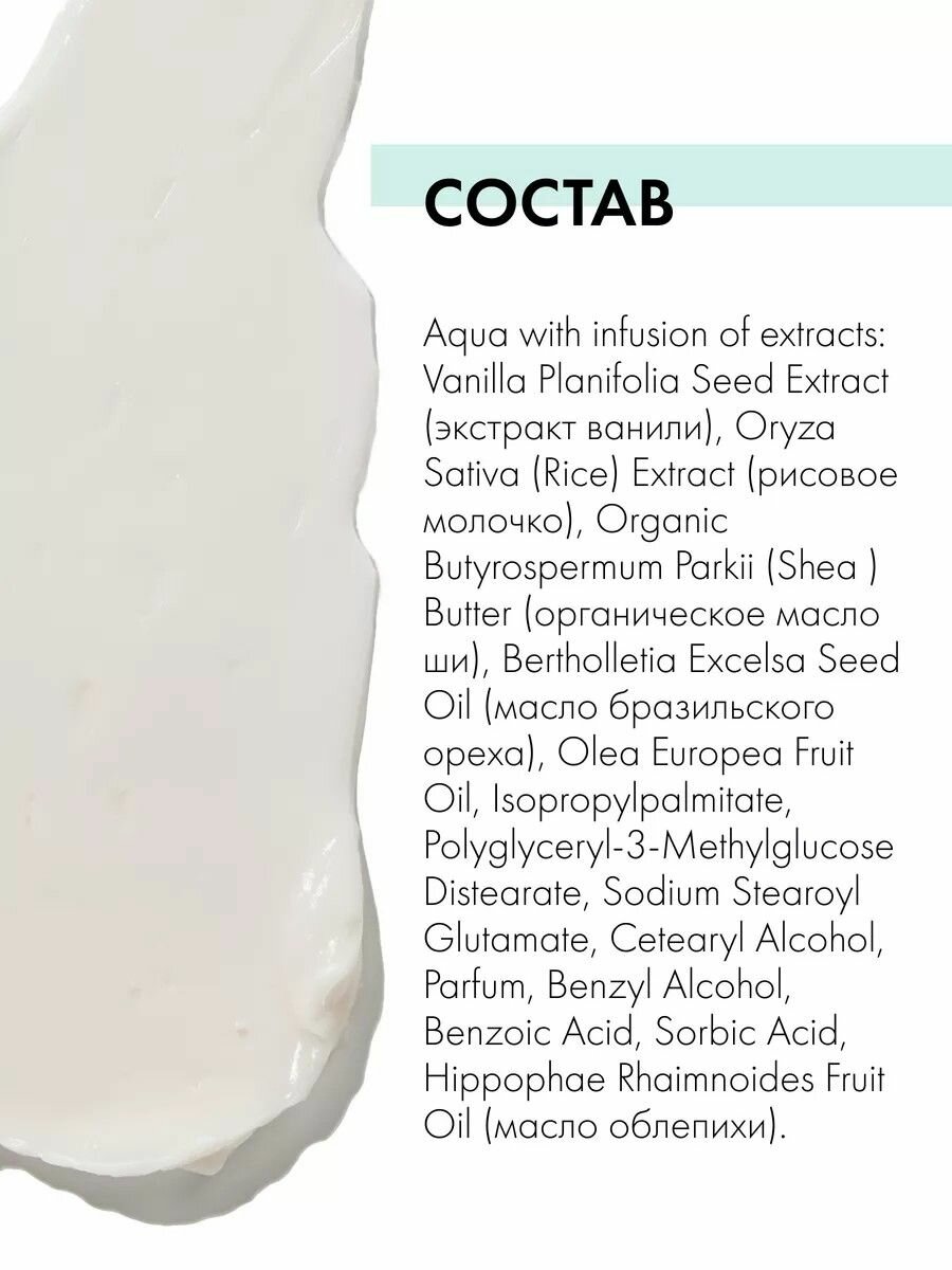 | Состав | aqua with infusion of extracts: vanilla planifolia seed extract(экстракт ванили), oryza sativa (rice) extract(рисовое молочко) ,organic butyrospermum parkii (shea ) butter(органическое масло ши), bertholletia excelsa seed oil( масло бразильского ореха), olea europea fruit oil, isopropylpalmitate, polyglyceryl-3-methylglucose distearate, sodium stearoyl glutamate, cetearyl alcohol, parfum, benzyl alcohol, benzoic acid, sorbic acid, hippophae rhaimnoides fruit oil (масло облепихи) |