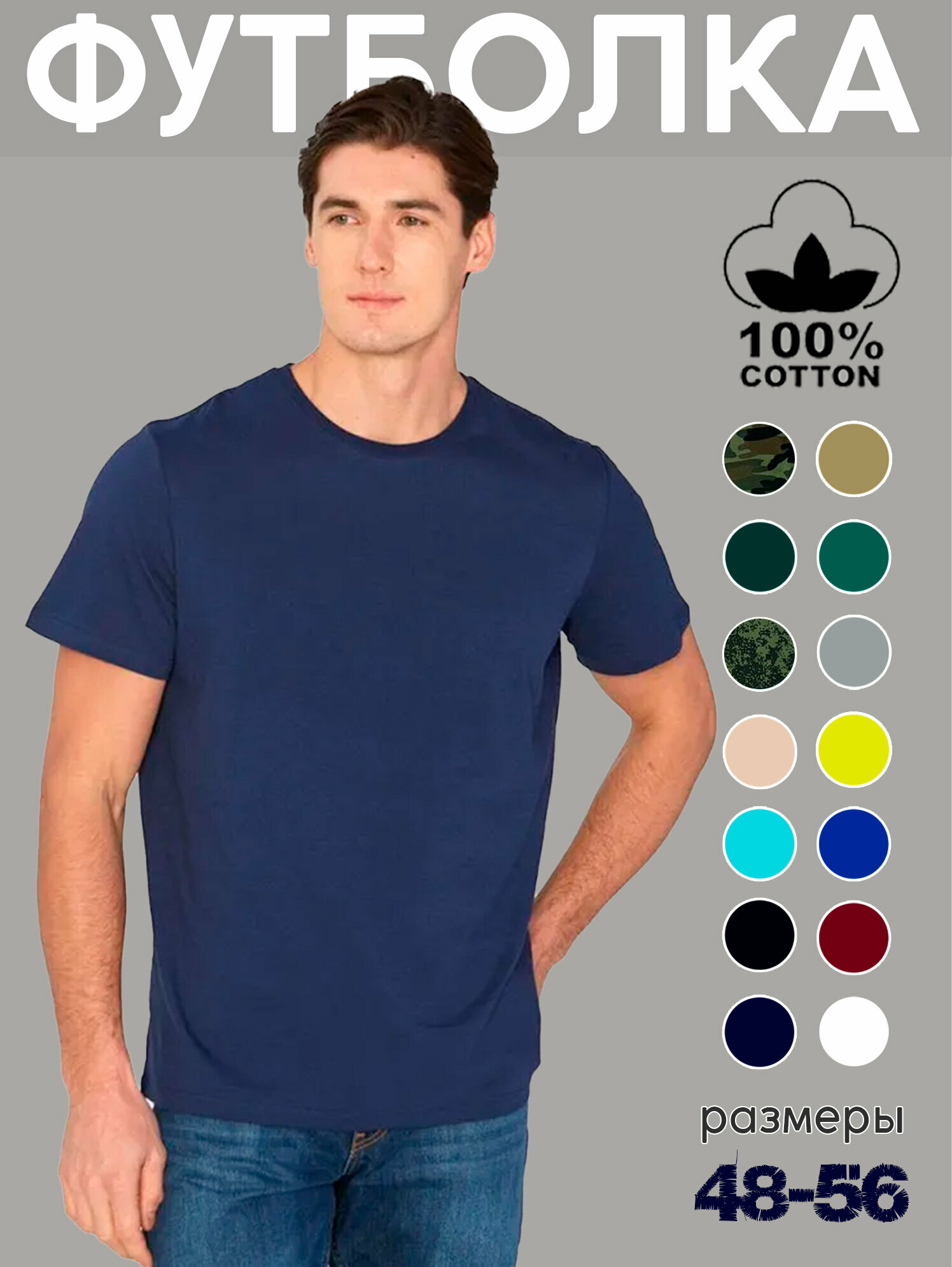 Футболка мужская однотонная синяя без принта, размер 48