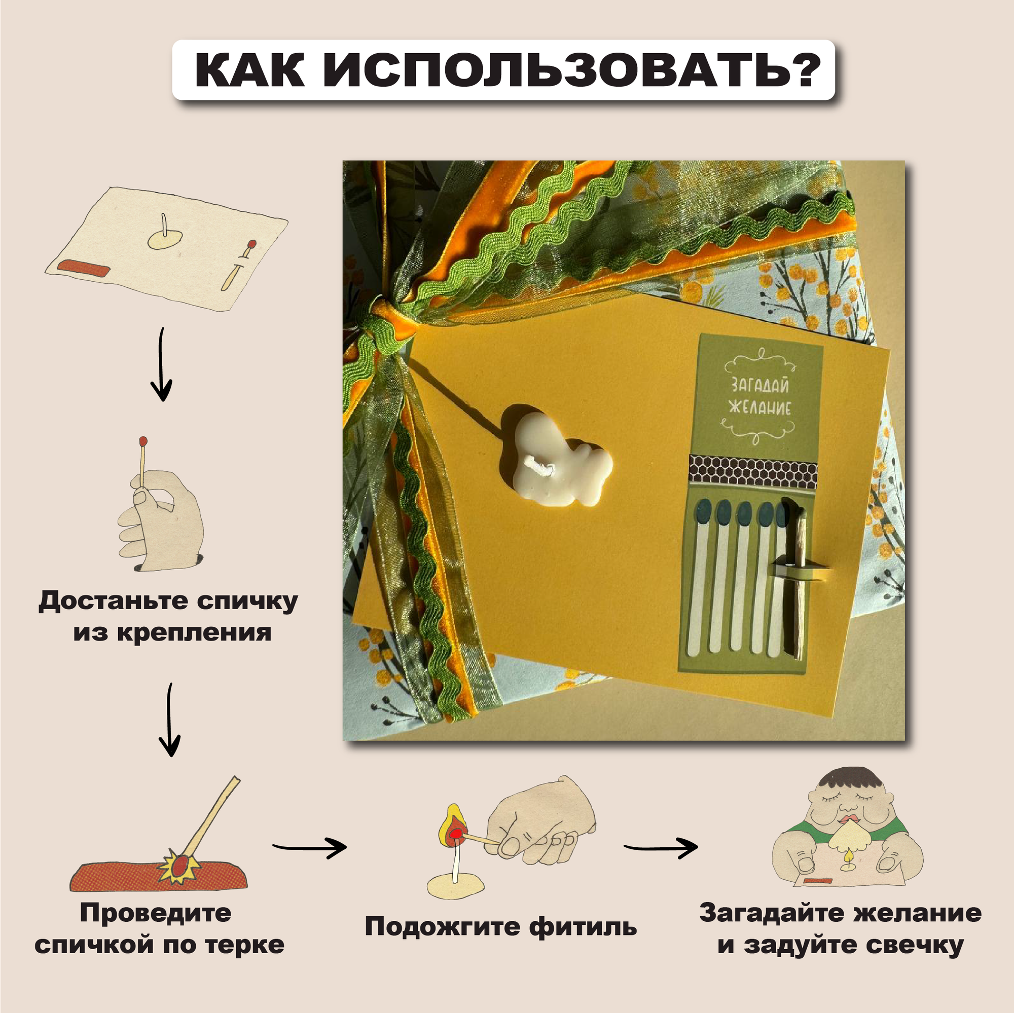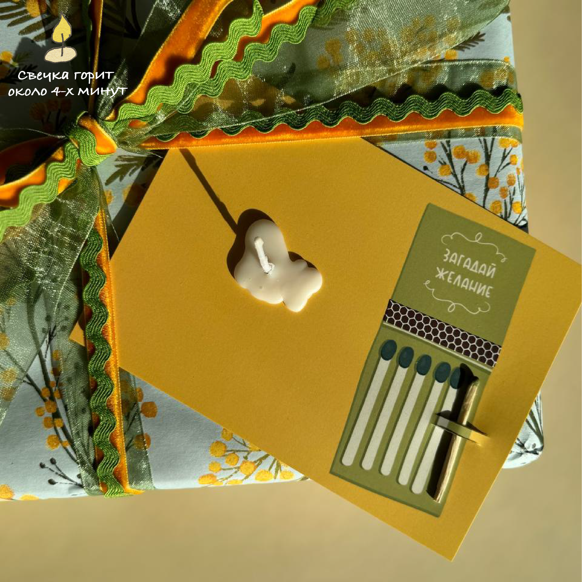 | Подробная комплектация | Свечка, спичка, фосфорная терка |