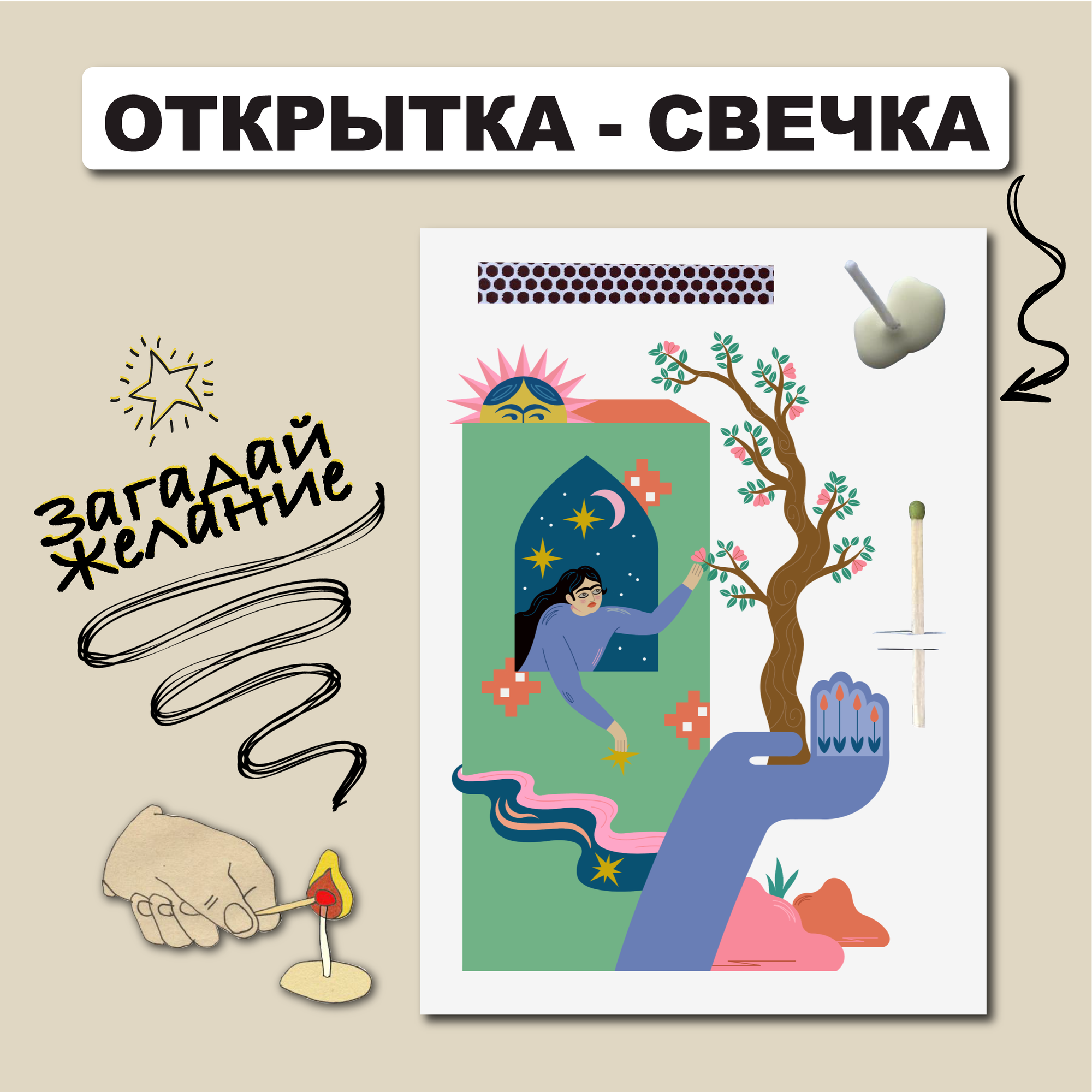 Открытка свечка "Загадай", от Вьюнчик, 14,8х10,5 см (А6), стильная поздравительная открытка на день рождения