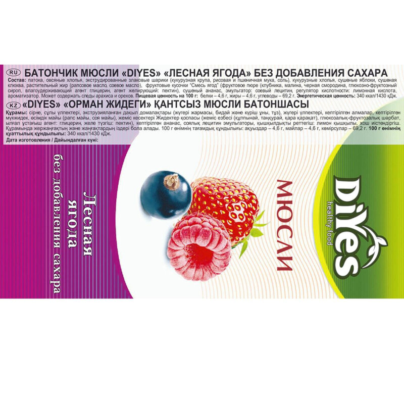 Батончик мюсли без сахара "Лесная ягода" от DiYes 36 шт - идеальный выбор для веганов и вегетарианцев!